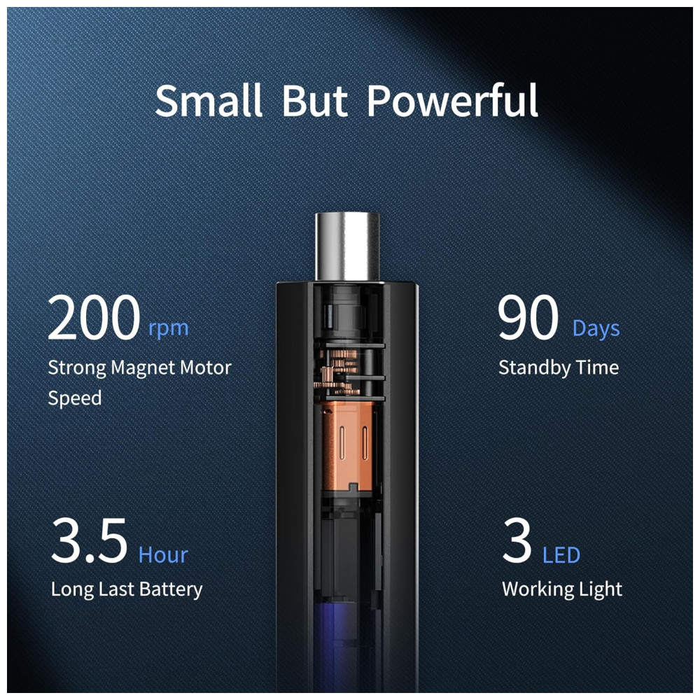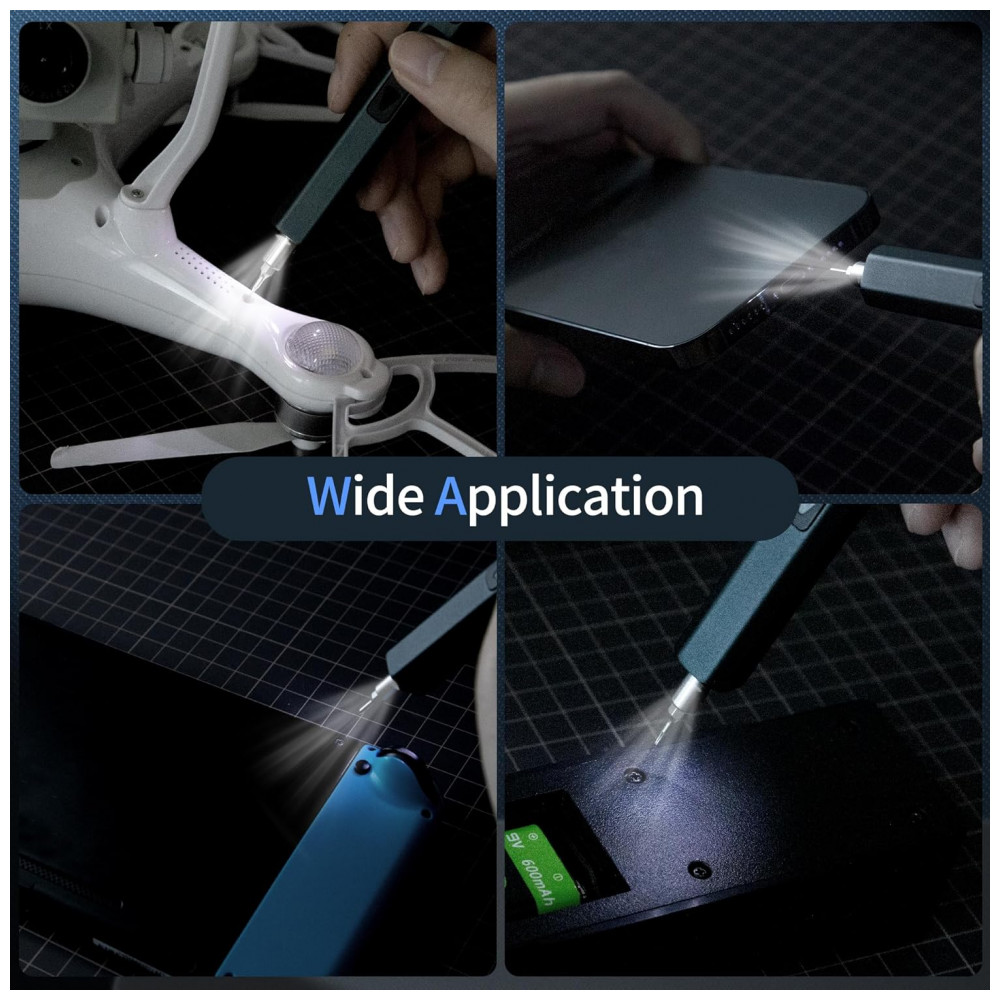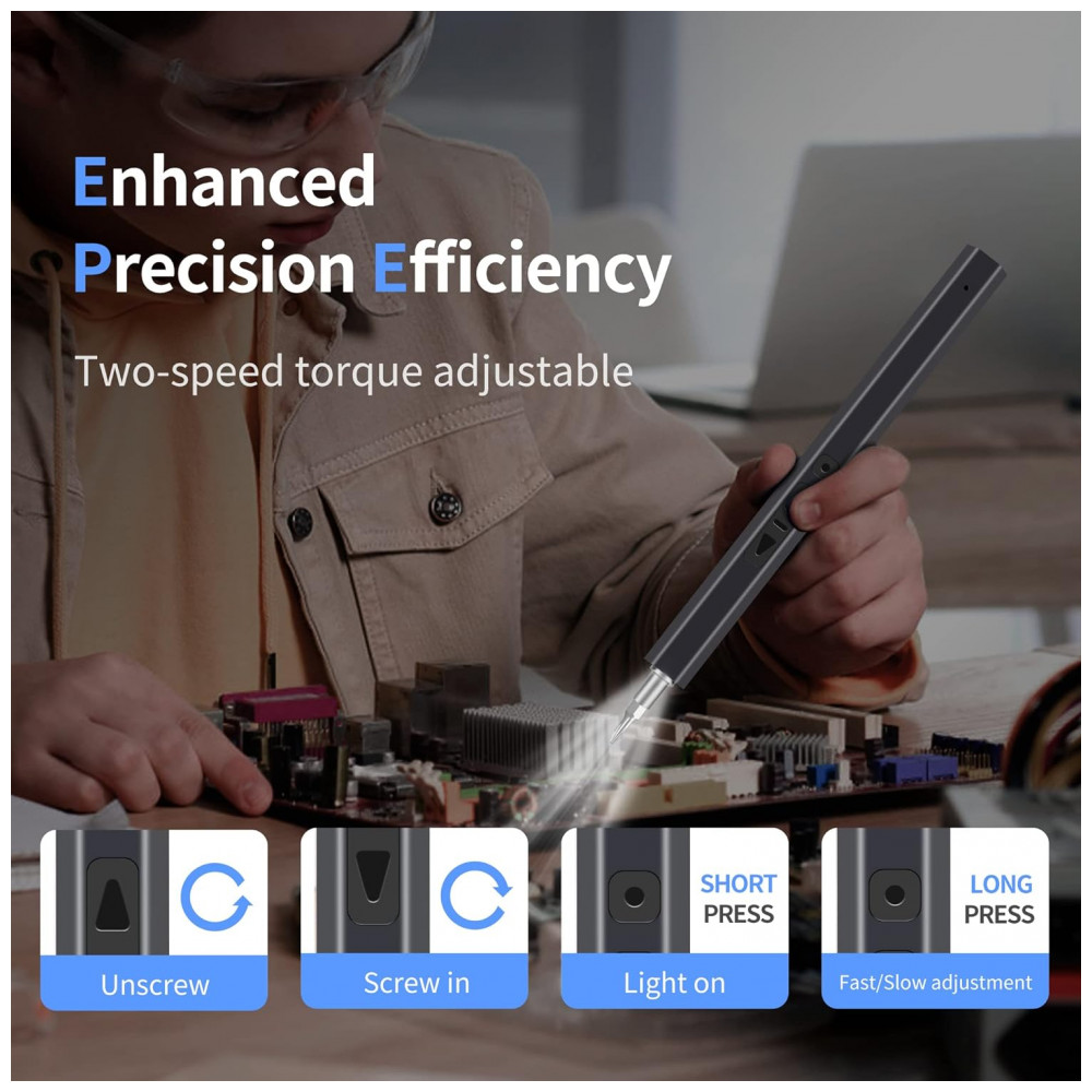 A bateria recarregável Li-ion de 3,7V oferece até 3,5 horas de uso por carga, com porta USB-C para recarga. São 2 ajustes de torque para diferentes tipos de parafusos, compatível com reparos em celulares, laptops, iPads, tablets, consoles de jogos, óculos e brinquedos.