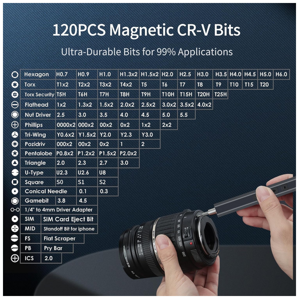 Conteúdo da caixa: 1 alça elétrica, 1 alça manual, 120 bits, base magnética, eixo de extensão, spudgers, copo de sucção, desmagnetizador, pinça, escova, esteira para parafusos, cabo USB-C.