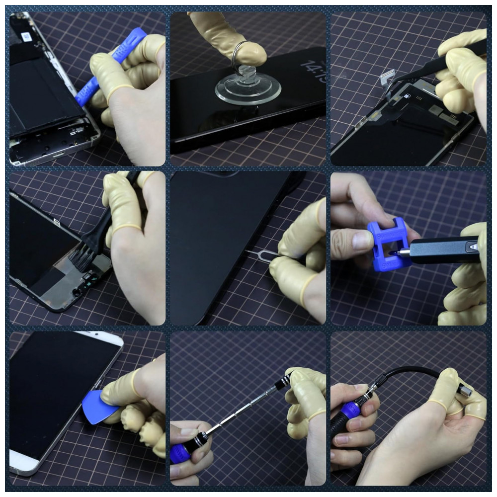 O conjunto XOOL 150 em 1 de chaves de fenda elétricas de precisão inclui 120 bits magnéticos e 30 acessórios para reparos em eletrônicos, como alças elétrica e manual, eixo de extensão, spudgers, copo de sucção, desmagnetizador, pinça, escova e esteira para parafusos. Projetado com base em dados de reparos, suporta uso em manutenção de dispositivos portáteis, com motor de até 200 RPM sem carga e botões para rotação direta e reversa.