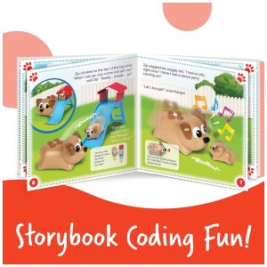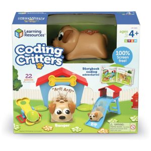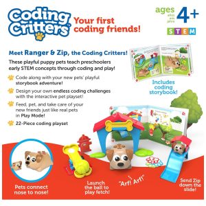 Apresentamos as criaturas da codificação, um conjunto de animais de estimação robôs que ajudam no aprendizado pré escolar de conceitos STEM por meio de 100 codificações sem tela. Com a ajuda do corajoso Ranger e do travesso Zip, as crianças podem codificar junto com sua nova aventura de livro de histórias de animais de estimação e ter um momento de brincadeira que nunca esquecerão. Cada desafio de codificação se desenrola no conjunto divertido de animais de estimação Coding critters. Além de acompanhar os desafios de codificação dos livros de histórias, você também pode usar o conjunto de animais de estimação para criar seus próprios jogos de código e muito mais. As criaturas Coding também funcionam como bichinhos de estimação interativos fofos. Pressione o nariz do Ranger para ativar o modo de jogo, onde você pode alimentar, acariciar e cuidar de seu novo amigo robô cachorrinho. Você pode até fazê lo dançar e cantar uma música boba. Este conjunto é composto por 22 peças para animais de estimação e é ideal para o desenvolvimento de habilidades STEM, como pensamento crítico e outras habilidades necessárias para o sucesso na escola e além. É um presente ideal para feriados, aniversários ou apenas porque sim, pois os brinquedos dos Recursos de Aprendizagem ajudam você a descobrir uma nova diversão de aprendizagem sempre que você dá um presente
