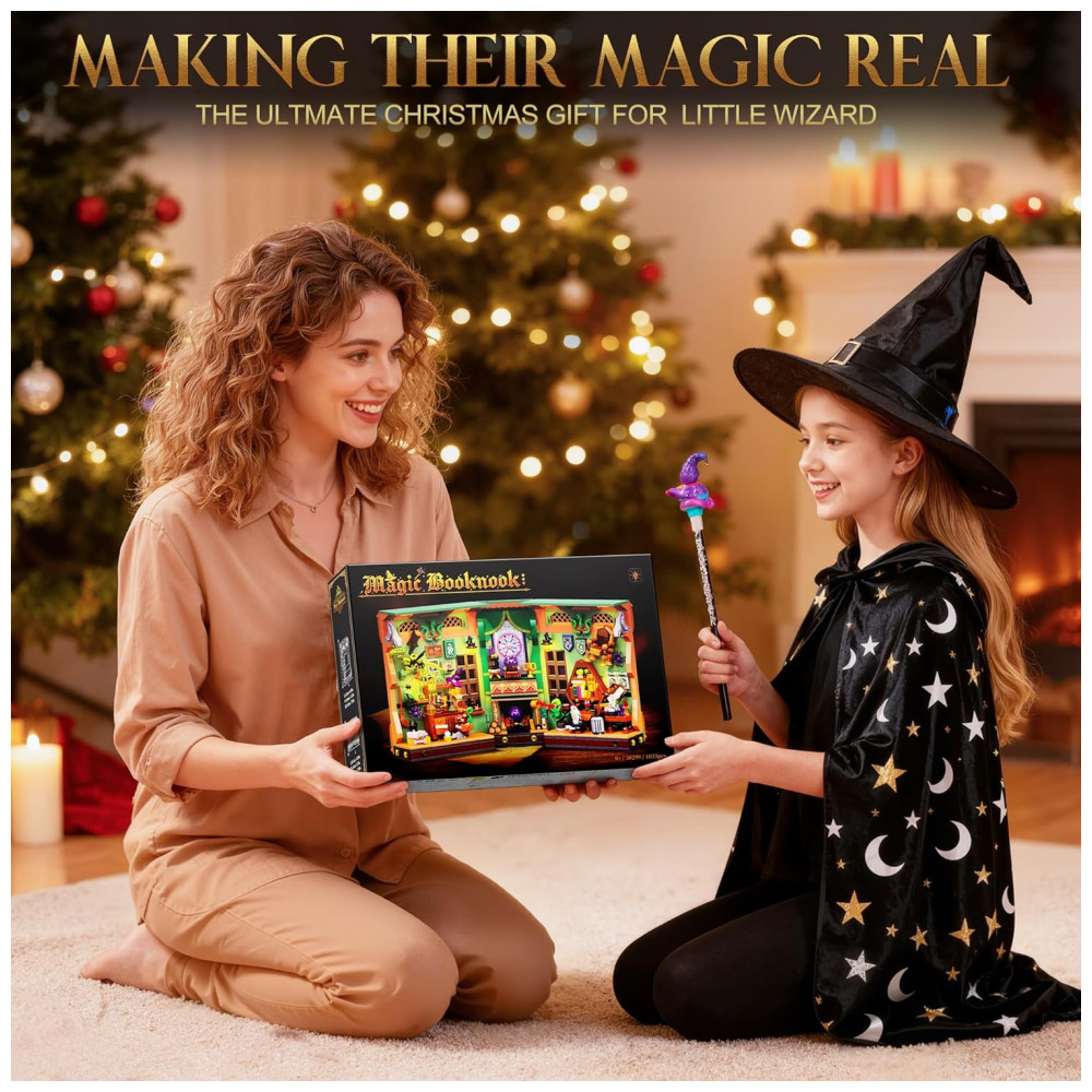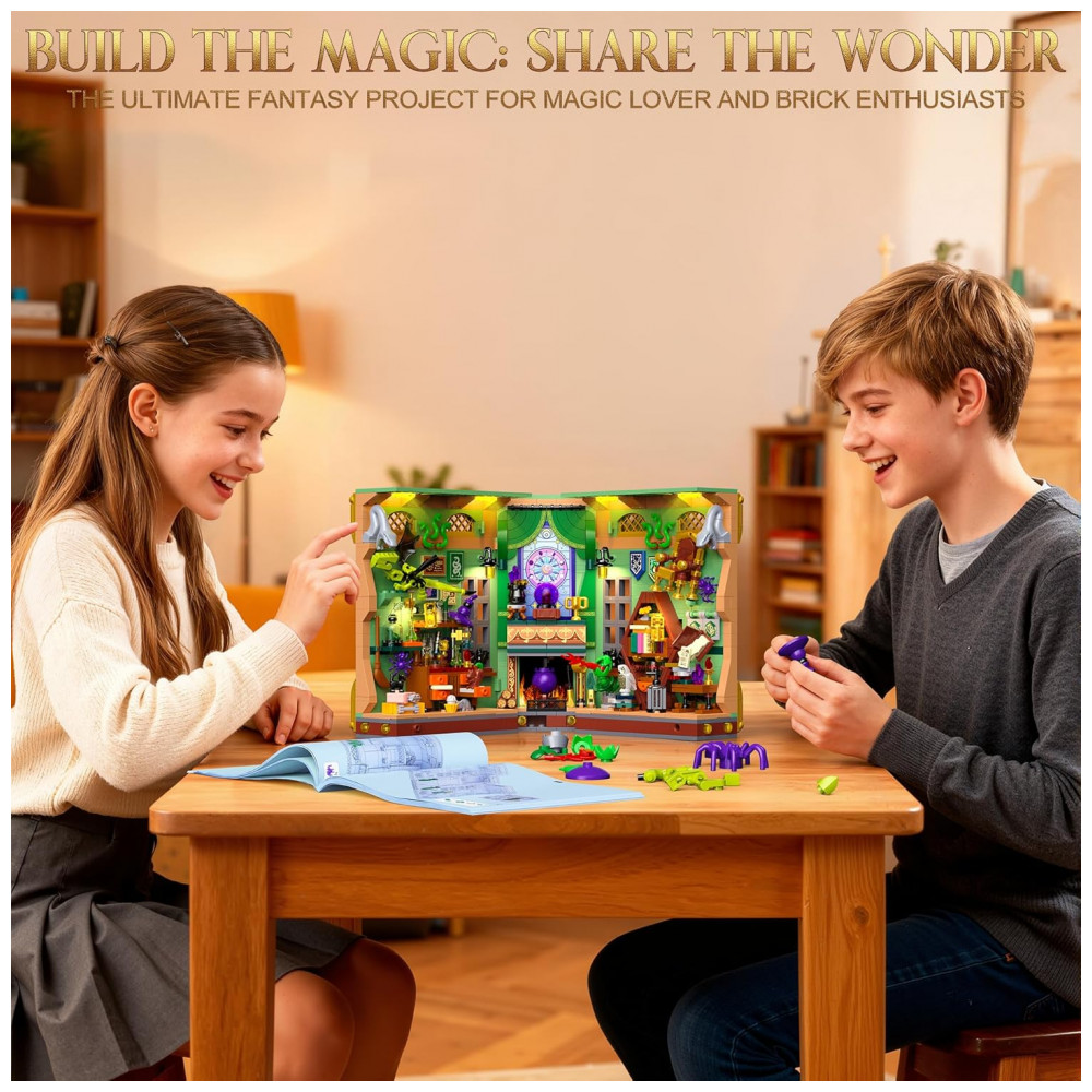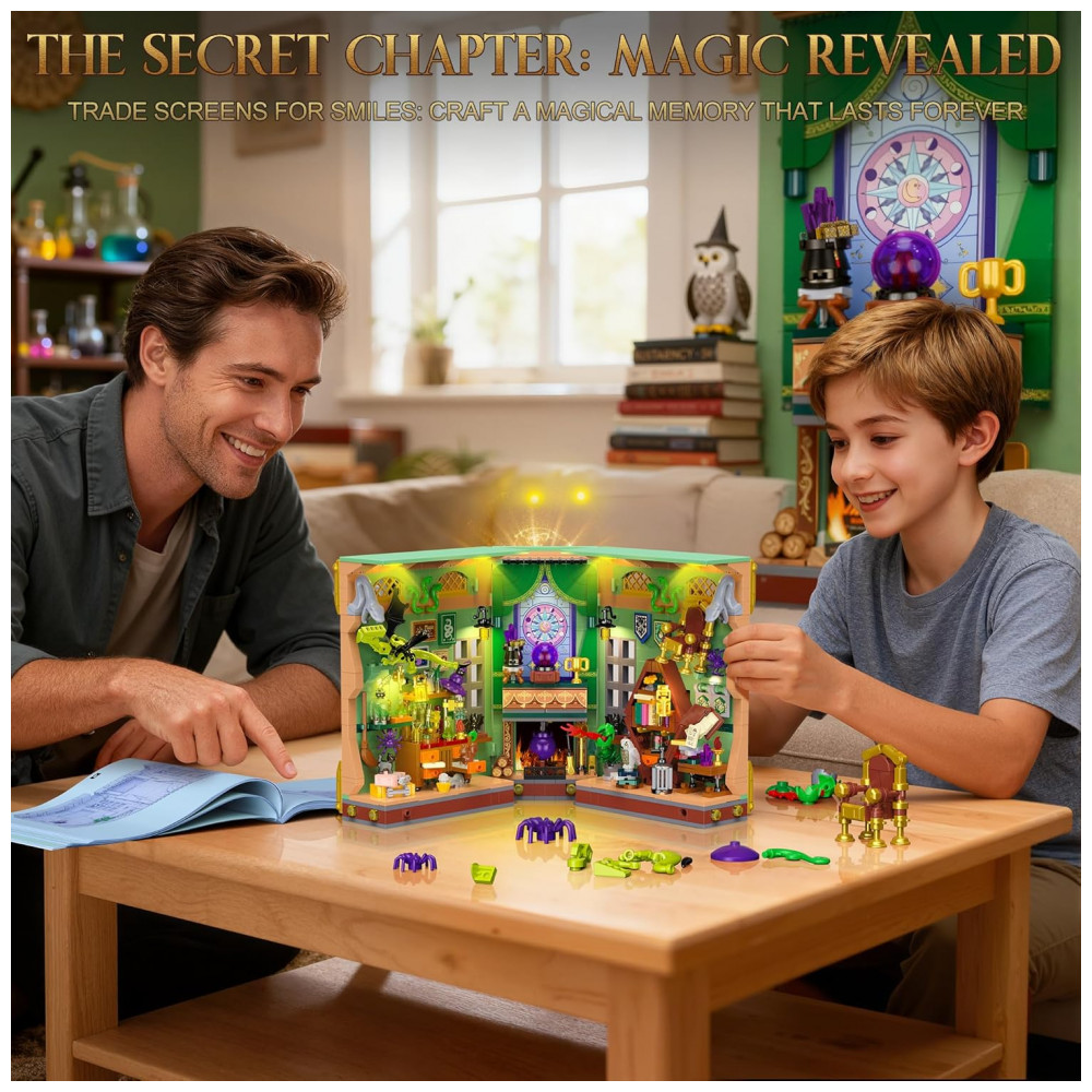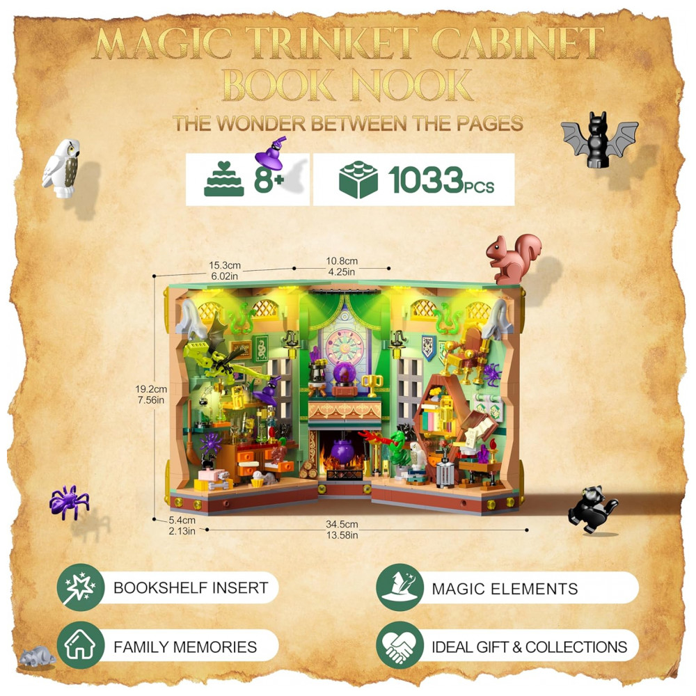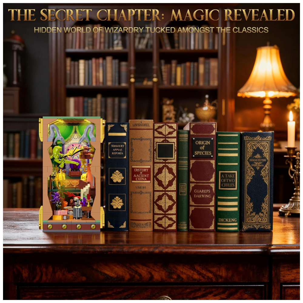 O OKKIDY Magic Potion Book Nook é um kit de construção tipo diorama em formato de livro que se abre como um volume de capa dura, formando uma cena tridimensional de laboratório de poções mágicas para uso como aparador de livros e peça decorativa em estantes. A estrutura é composta por 1033 blocos de encaixe compatíveis, permitindo a montagem de uma “casa em miniatura” temática, com bancada, estantes, caldeirão, frascos de poções e elementos mágicos detalhados.