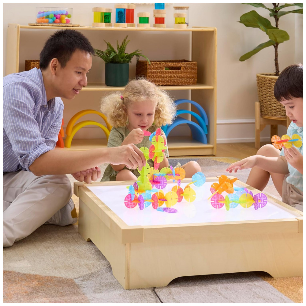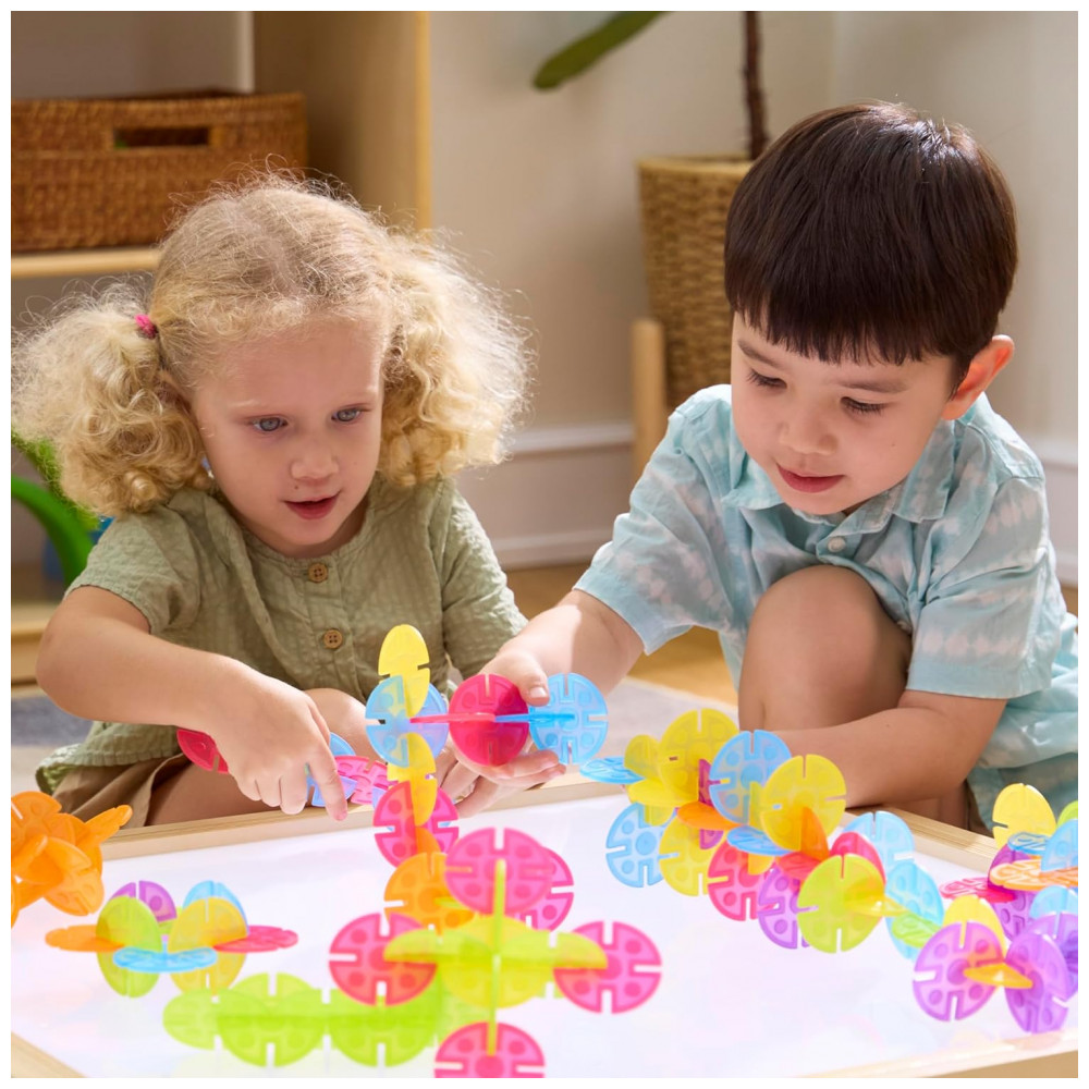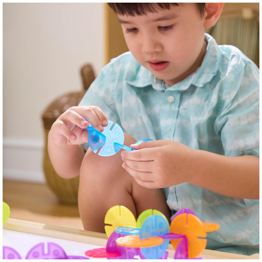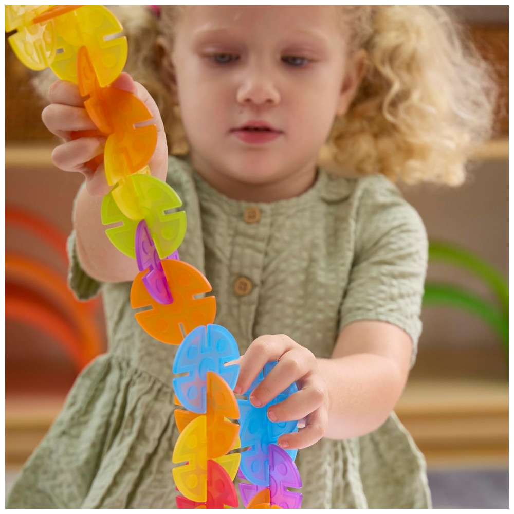 Os 96 discos estão distribuídos em cinco cores vibrantes, com relevos geométricos em cada peça, favorecendo exploração de simetria, combinação de cores e equilíbrio em contextos de aprendizagem STEM. As peças podem ser usadas sobre mesas de luz para atividades de cor e transparência e são compatíveis com o conjunto Interlox original, ampliando as possibilidades de construção quando os dois sets são combinados.