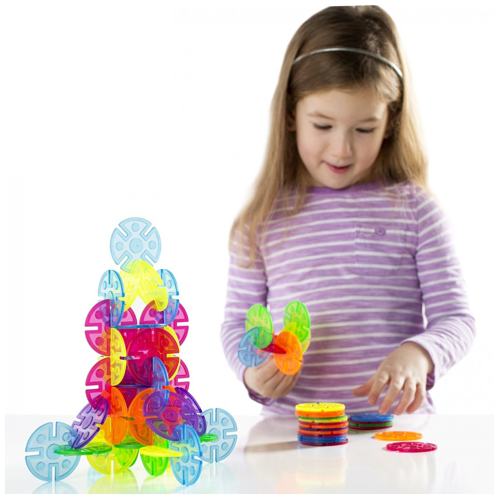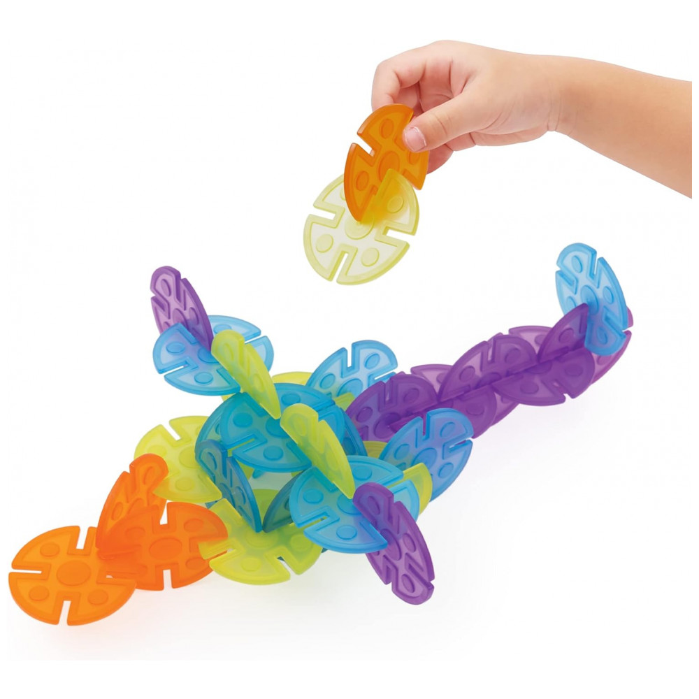 O Guidecraft Interlox Discs é um conjunto de construção com discos plásticos translúcidos que se encaixam pelas bordas, indicado para crianças a partir de 2 anos, permitindo criar estruturas abertas em diferentes direções. As peças circulares possuem várias ranhuras ao redor, o que facilita conexões em múltiplos ângulos e a formação de construções mais complexas, como torres, flores, figuras abstratas e elementos geométricos.