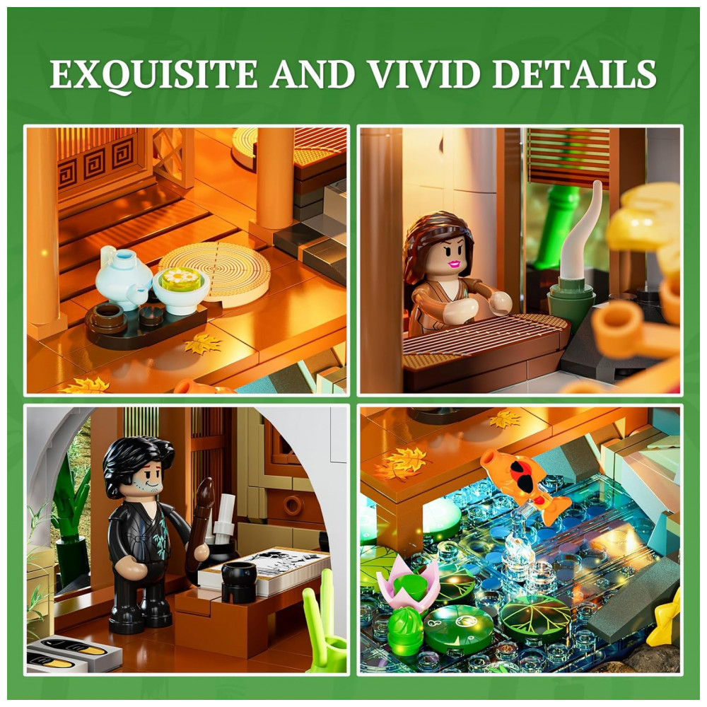 Conjunto de blocos de montagem para adultos com 2432 peças e kit de iluminação LED integrado, inspirado em casas e jardins tradicionais chineses. O modelo reproduz uma cabana de bambu com árvore de bordo dourada, pátio interno, lago com carpas koi e áreas temáticas como espaço para cerimônia do chá, canto para tocar guqin e sala de pintura com elementos decorativos orientais.