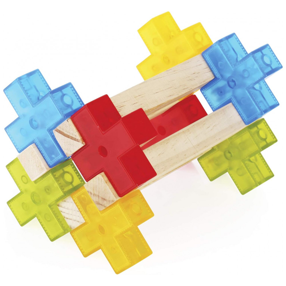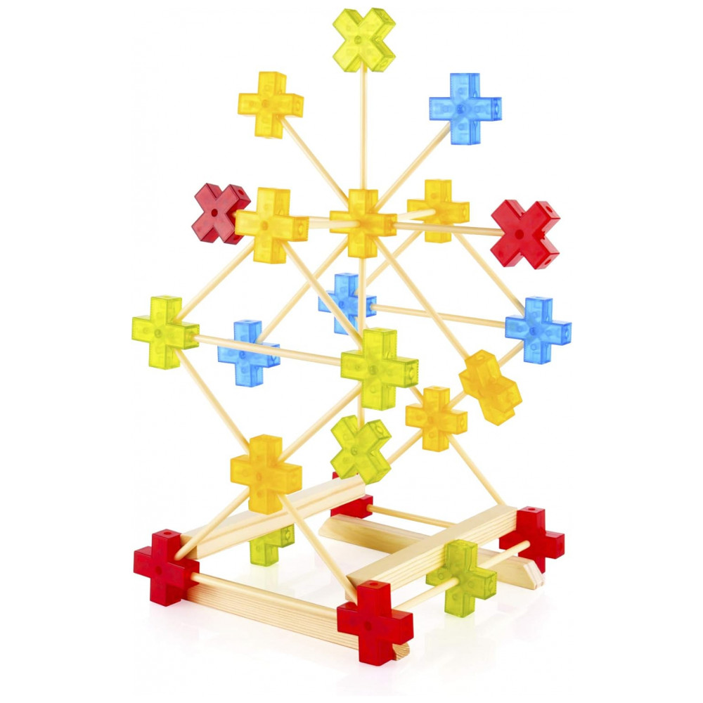 As peças se conectam por meio de conectores plásticos moldados com precisão geométrica, que recebem hastes e painéis de madeira, oferecendo uma experiência de construção que trabalha coordenação motora fina, noções de escala e princípios básicos de engenharia. O conjunto acompanha um guia de atividades detalhado com instruções passo a passo e comentários sobre diferentes possibilidades de uso, apoiando educadores e famílias na condução de propostas orientadas em contexto STEM.