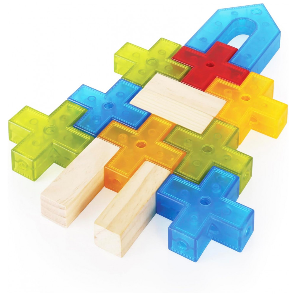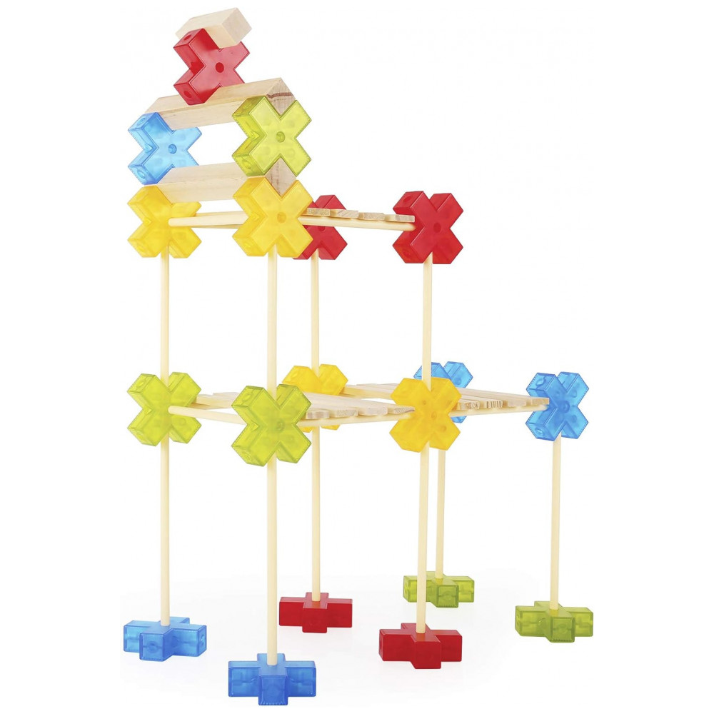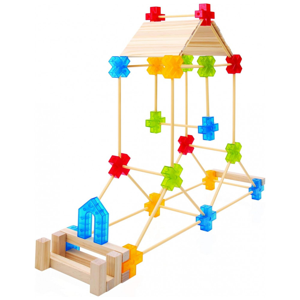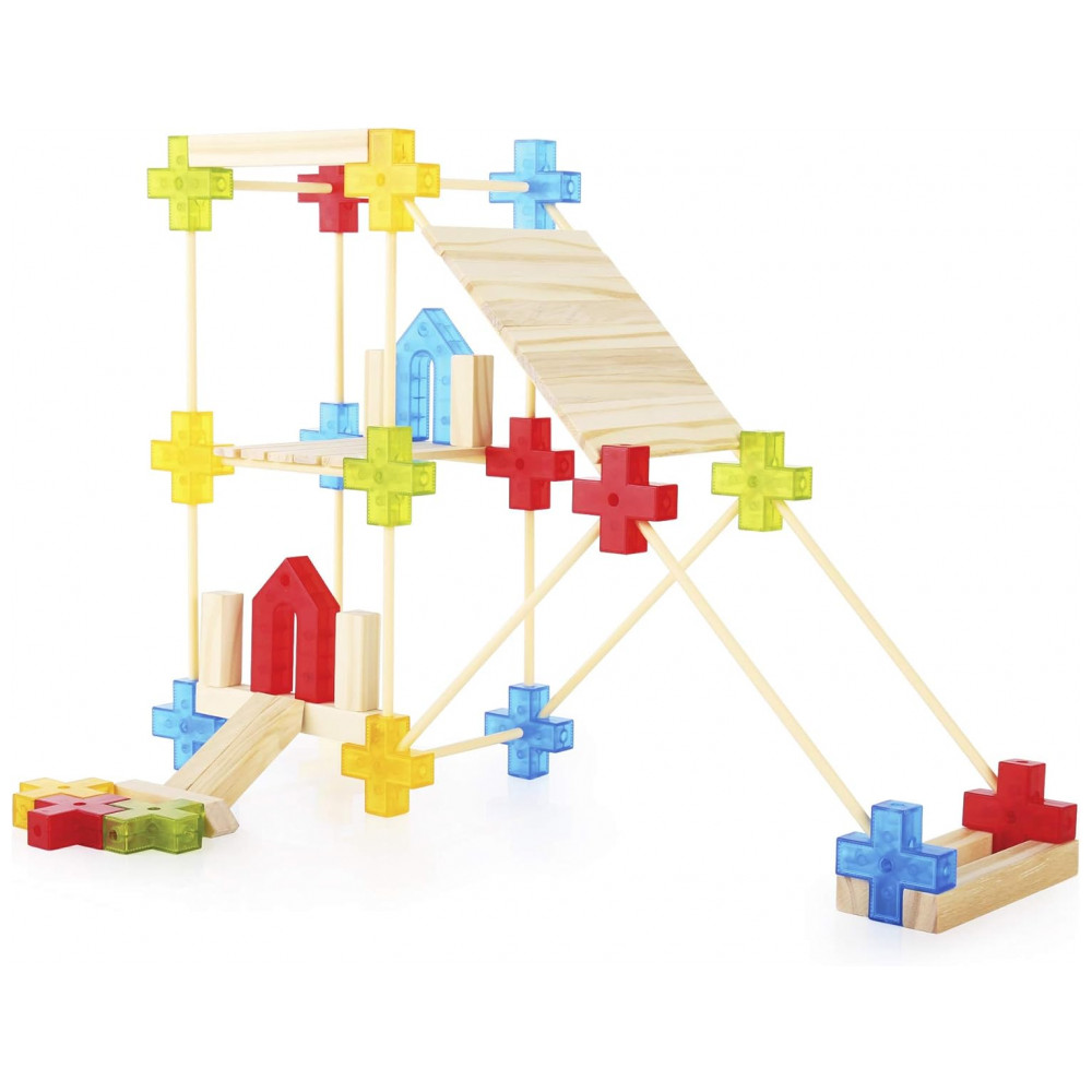 O Guidecraft Texo 100 Piece Set é um sistema de construção em 3D voltado para crianças a partir de 3 anos, que combina hastes plásticas, conectores geométricos e pranchas de madeira para criar modelos arquitetônicos simples e avançados. O brinquedo permite desde encaixes básicos, como quebra-cabeças, classificação de formas e combinação de cores, até a montagem de pontes, casas, arranha-céus e outras estruturas complexas.