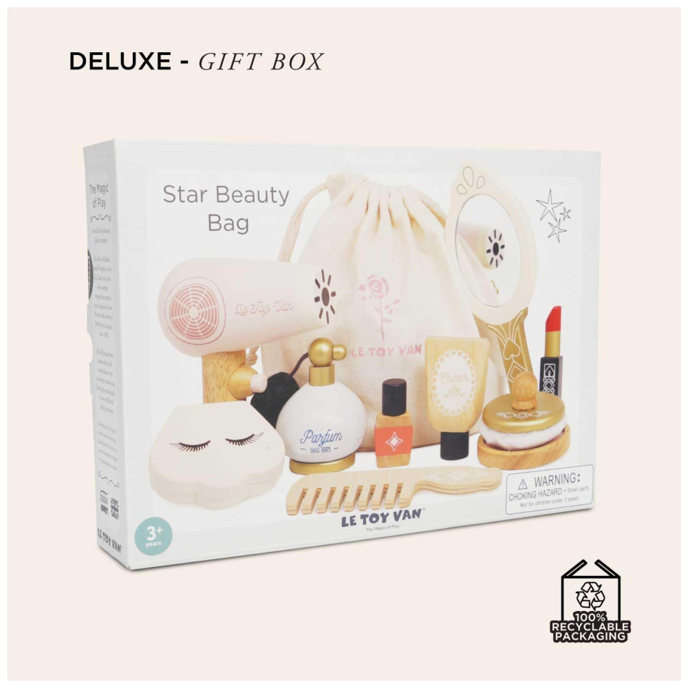 Brinquedo Seguro e Ecológico: Decorado com tintas não tóxicas e testado de acordo com os mais altos padrões de segurança, a Star Beauty Bag é feita com materiais naturais, como madeira de borracha lisa e renovável. Com técnicas de serigrafia manual e coloração com tintas à base de água, este brinquedo oferece qualidade e segurança, além de ser durável e encantador para as mãos pequenas.