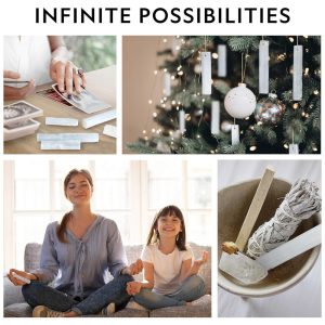 GEMAS E CRISTAIS ADICIONAIS Junto com as belas varinhas de cristal de selenita, você também receberá 5 pedras de cristal polidas e deslumbrantes, incluindo hematita, quartzo rosa, ponto de quartzo, aventurina verde e quartzo azul.
