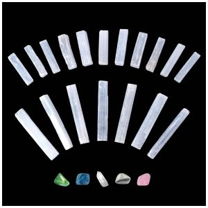 VARINHAS SELENITE PREMIUM Esta selenita é verdadeiramente especial. Varinhas longas medem até 12,7 centímetros e varinhas curtas medem até 7,62 centímetros. Cada varinha tem entre 0,64 centímetros e 1,27 centímetros de espessura. Existem aproximadamente 5 varinhas longas e 15 varinhas curtas no conjunto.