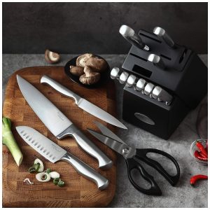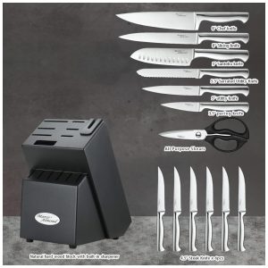 Conjunto de facas afiadas para uso geral Marco Almond O conjunto de facas de 14 peças inclui 14 peças Facas para bife, 1pc para todos os fins de cozinha, 1pc preto para facas de madeira. Marco Almond O conjunto de facas de aço japonês de alto carbono KYA28 é composto por 8 tipos diferentes de facas , tesouras artesanato excelente, forjado em peça única, tecnologia de ponta, elementos de design impressionantes e materiais de primeira qualidade, o cabo de aço inoxidável faz com que essas facas sejam ajustadas não apenas afiadas, mas também com boa sensação de mão ao usar Conjunto de facas afiadas e premium Os conjuntos de facas Marco Almond são feitos de aço japonês de alto carbono de alta qualidade, à prova de ferrugem e durável. Perfeito para profissionais e iniciantes. Sem ferrugem, manchas e corrosão aqui As facas são resistentes o suficiente para mantenha o durável por vários anos. Apontador embutido O bloco de facas é apontado para afiar as facas, o que é super conveniente para o uso diário. Quando as facas estão embotadas, você não precisa comprar apontador extra para afiá las. Todas as facas zenam com segurança no bloco de facas de madeira e podem economizar espaço de zenamento limpe manualmente e não use a máquina de lavar louça