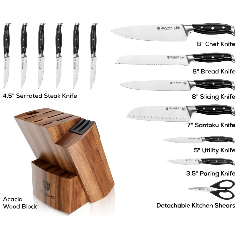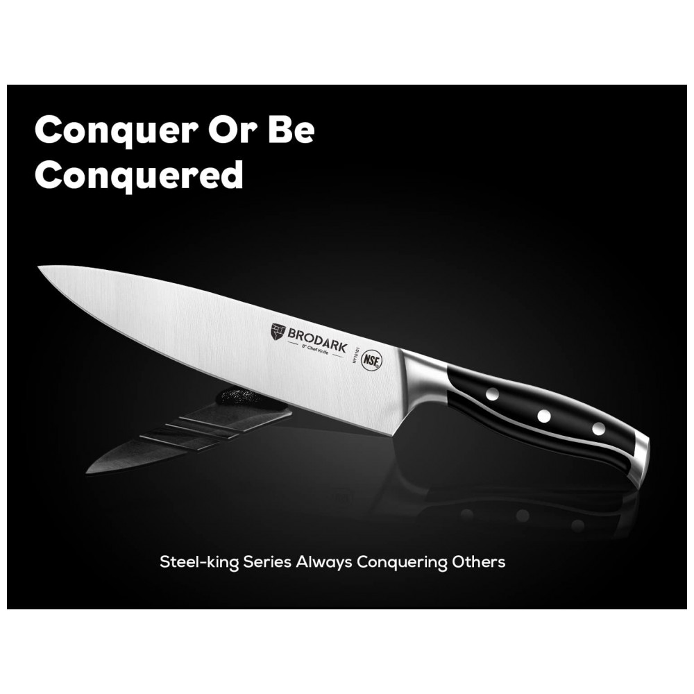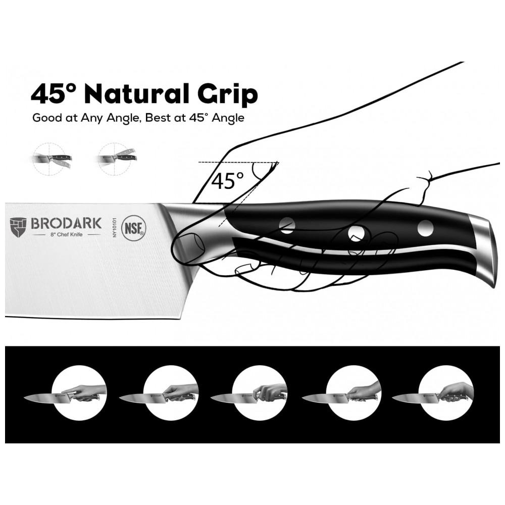 UM PRESENTE PARA VOCÊ Para quem você se importa, deve enviar um presente melhor. Da lâmina ao cabo, com 5 upgrades. Permanece afiado por mais tempo, aderência natural de 45, NSF para segurança alimentar, full tang com dupla camada e fabricação de aço independente. Conjunto de facas de cozinha BRODARK, deve ser o melhor presente para casamento, aniversário, inauguração de casa, Ação de Graças, Natal. Mas isso é só o começo, a BRODARK tem a missão de fazer de você um cozinheiro melhor.