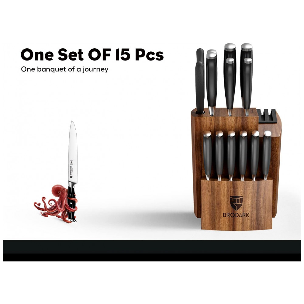 Conjunto de Facas BRODARK em Aço Inoxidável com Bloco de Bancada Multinível 15 Peças Preta