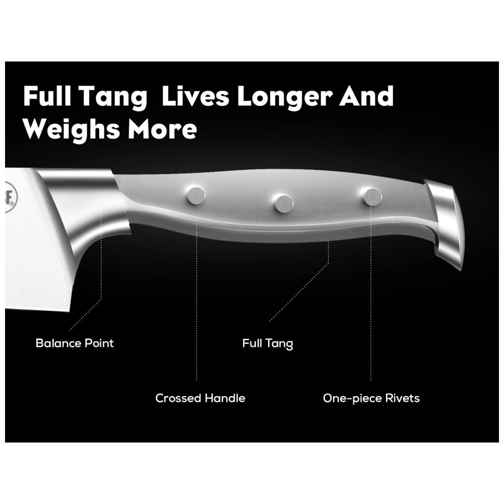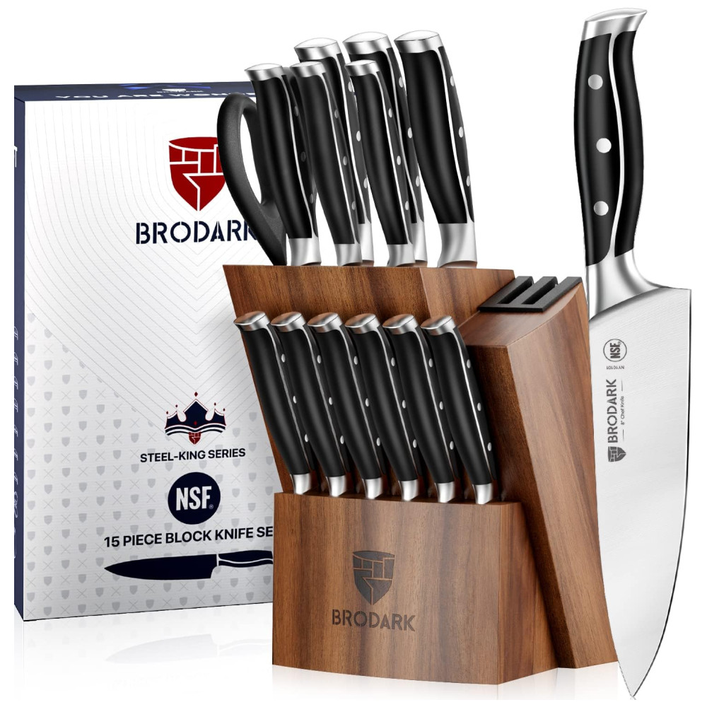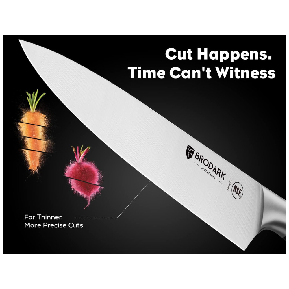 SUPER AFIADA As facas de cozinha BRODARK são feitas de aço inoxidável alemão de alto carbono premium, facas de ponta em forma de V, apenas 14 graus de lâmina por lado, o que dá às suas lâminas uma borda mais afiada. A dureza Rockwell de 552 fornece o dobro da retenção da borda. A película protetora de 14,82 CR é mais à prova de ferrugem e tem uma vida útil mais longa.