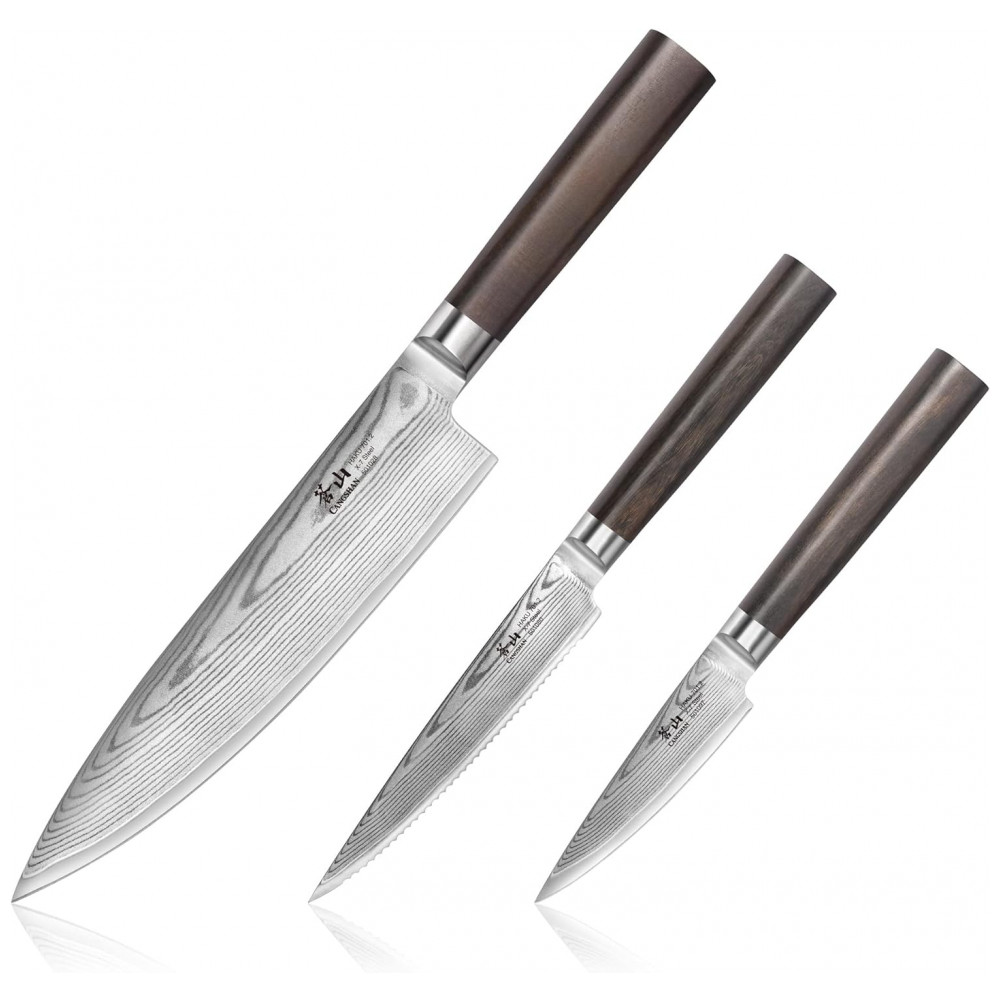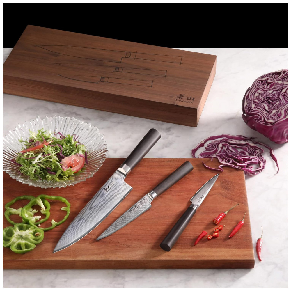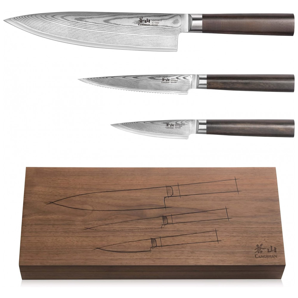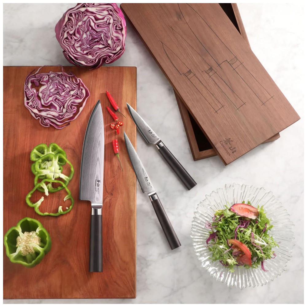 Conjunto de Facas Cangshan HAKU 501172 em Aço Damasco Forjado X 7 com Caixa de Nogueira 3 Peças Marrom