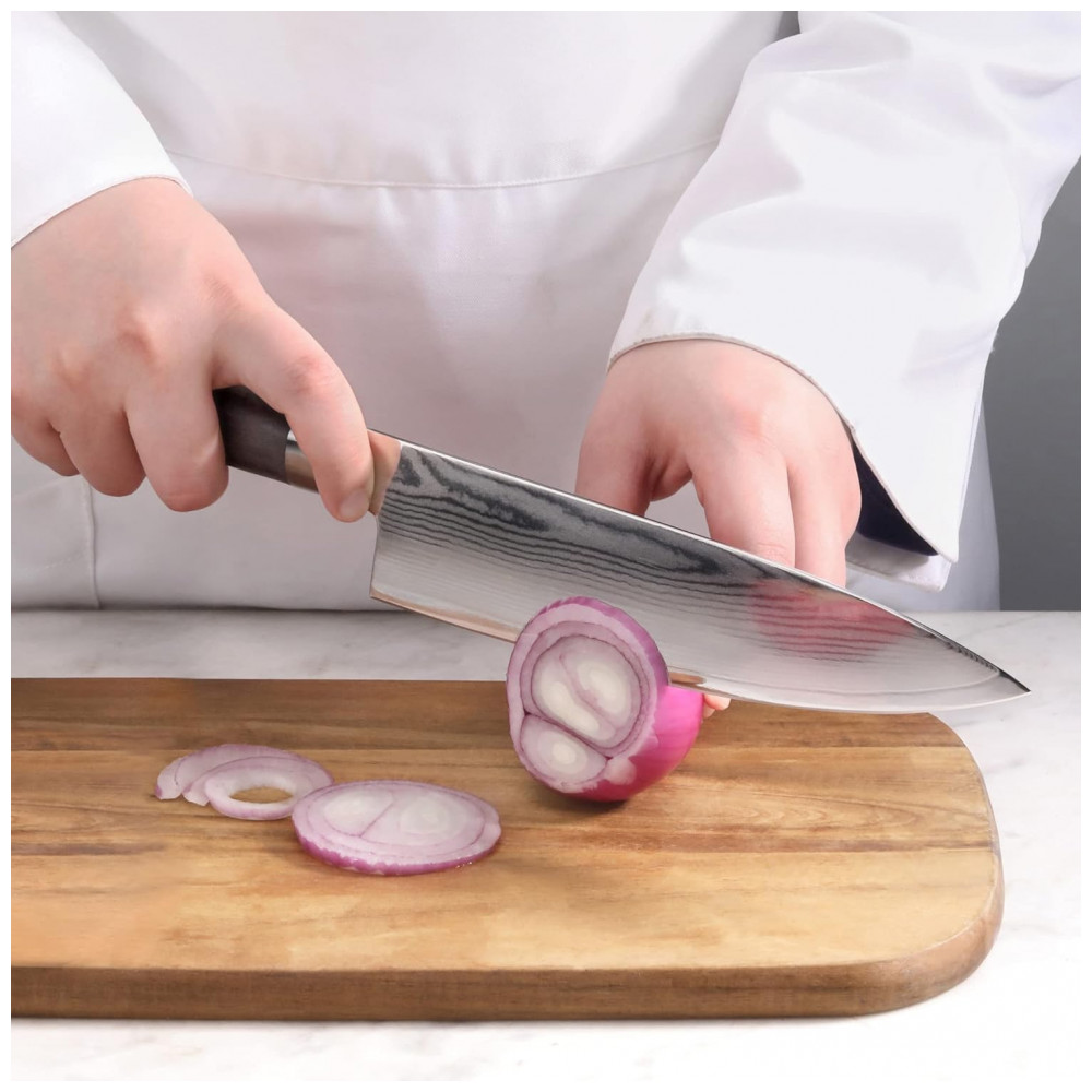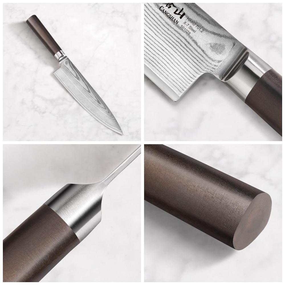 Forjado a partir de 67 camadas de X 7 Damascus Steel, propriedade da Cangshan.