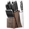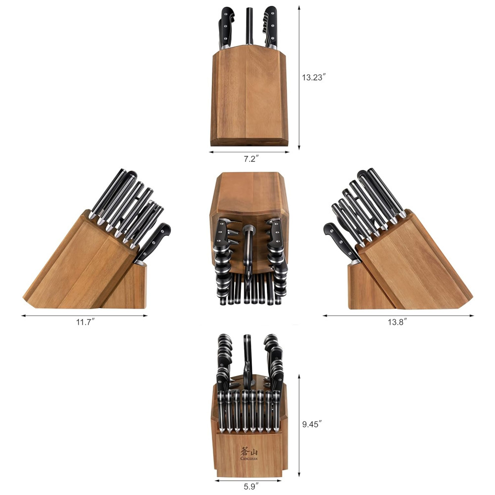 Faca total forjada em aço alemão X50Cr15MoV de alta liga com nitidez excepcional Facas de design patenteadas focam na alça ergonômica que fornece uma aderência fácil e confortável madeira maciça de acácia O bloco trabalha com as facas com bom gosto, cada bloco é feito à mão e possui seu próprio grão certificado pela National Sanitation Foundation NSF.