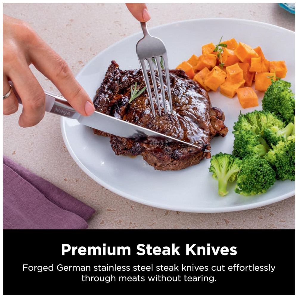 Além das facas de chef e especializadas, o conjunto inclui facas de carne de alta qualidade em aço inoxidável alemão, perfeitas para impressionar seus convidados com cortes de carne suaves e precisos.
