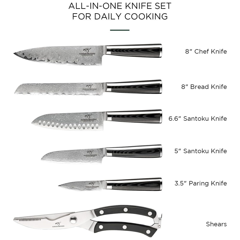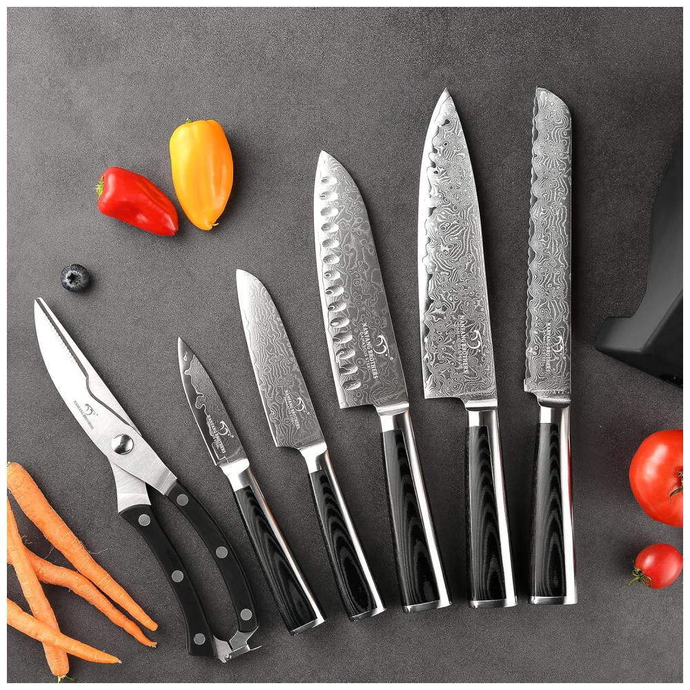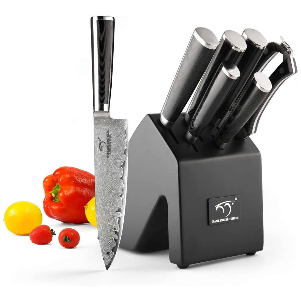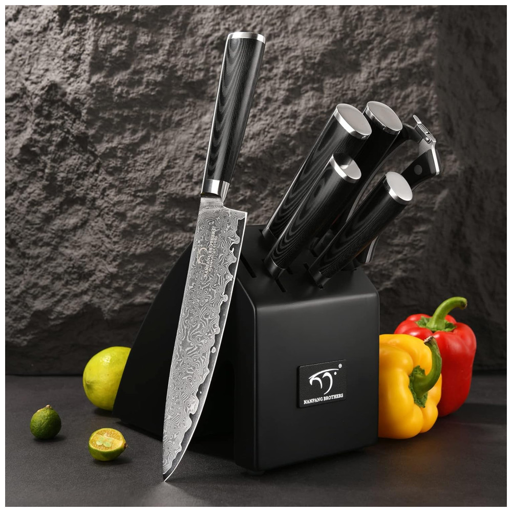 MICARTA HANDLE O cabo deste material é resistente a altas temperaturas, tem uma textura e é leve, durável e super resistente à corrosão. Os conjuntos de facas profissionais NANFANG BROTHERS com estrutura requintada tornam o cabo resistente o suficiente e forte o suficiente para suportar a força.