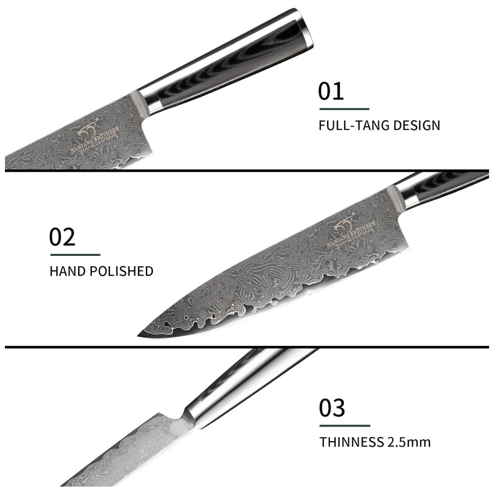 Aço Damasco de alta qualidade Feito de aço Damasco de 67 camadas de alta qualidade, tratamento térmico a vácuo, dureza de até 62HRC. Ele também tem as características de resistência à corrosão, antiferrugem e tenacidade forte. O padrão de onda exclusivo de Damasco mostra habilidade impressionante e personalidade artística.