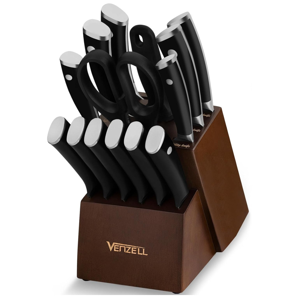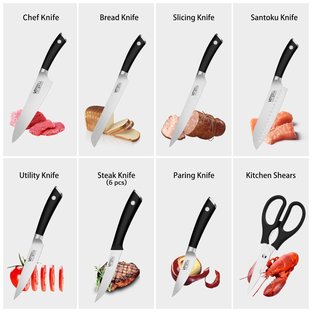 Conjunto completo de facas de cozinha perfeitas para uso doméstico O conjunto de facas afiadas VENZELL cobre todas as suas demandas diárias e otimiza a utilização do espaço. O conjunto de bloco de faca de cozinha inclui 1 peça de faca de chef de 20,32 centímetros, 1 peça de faca de pão de 20,32 centímetros, 1 peça de faca de corte de 20,32 centímetros, 1 peça de faca santoku de 17,78 centímetros , 1 peça de faca utilitária de 12,7 centímetros, 1 peça de faca de aparar de 8,89 centímetros, 1 peça de 20,32 centímetros tesouras de cozinha, 1 peça de haste de afiar de 20,32 centímetros, 6 peças de facas serrilhadas de 11,43 centímetros, 1 peça de bloco de madeira de borracha. O conjunto de facas certo para trabalhar com qualquer ingrediente.