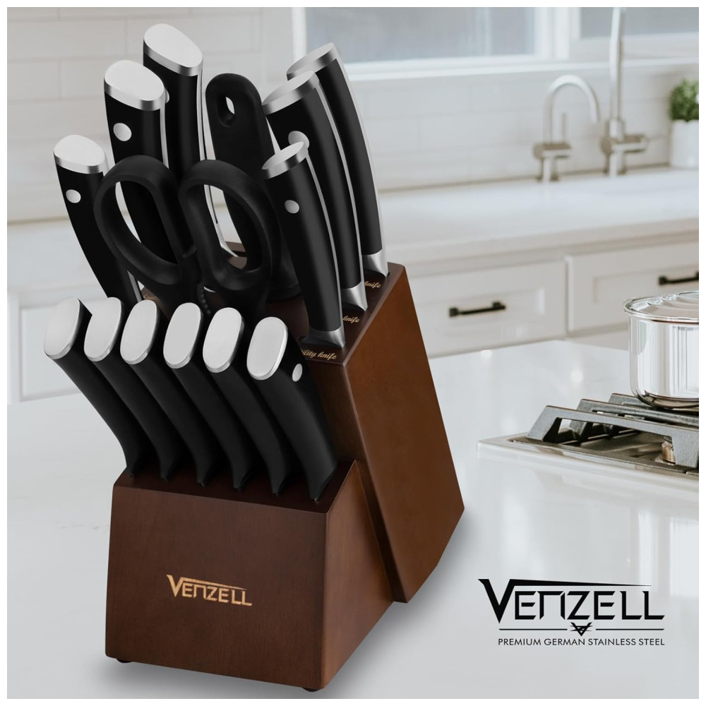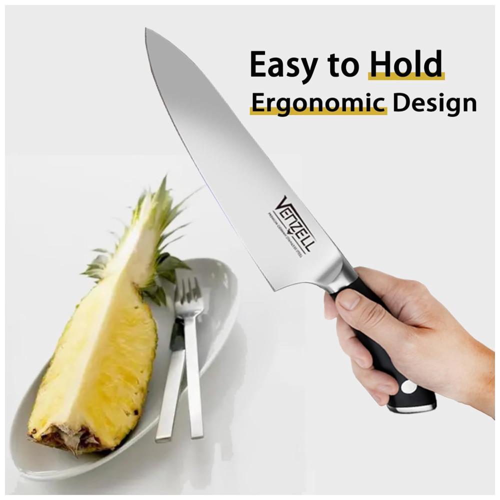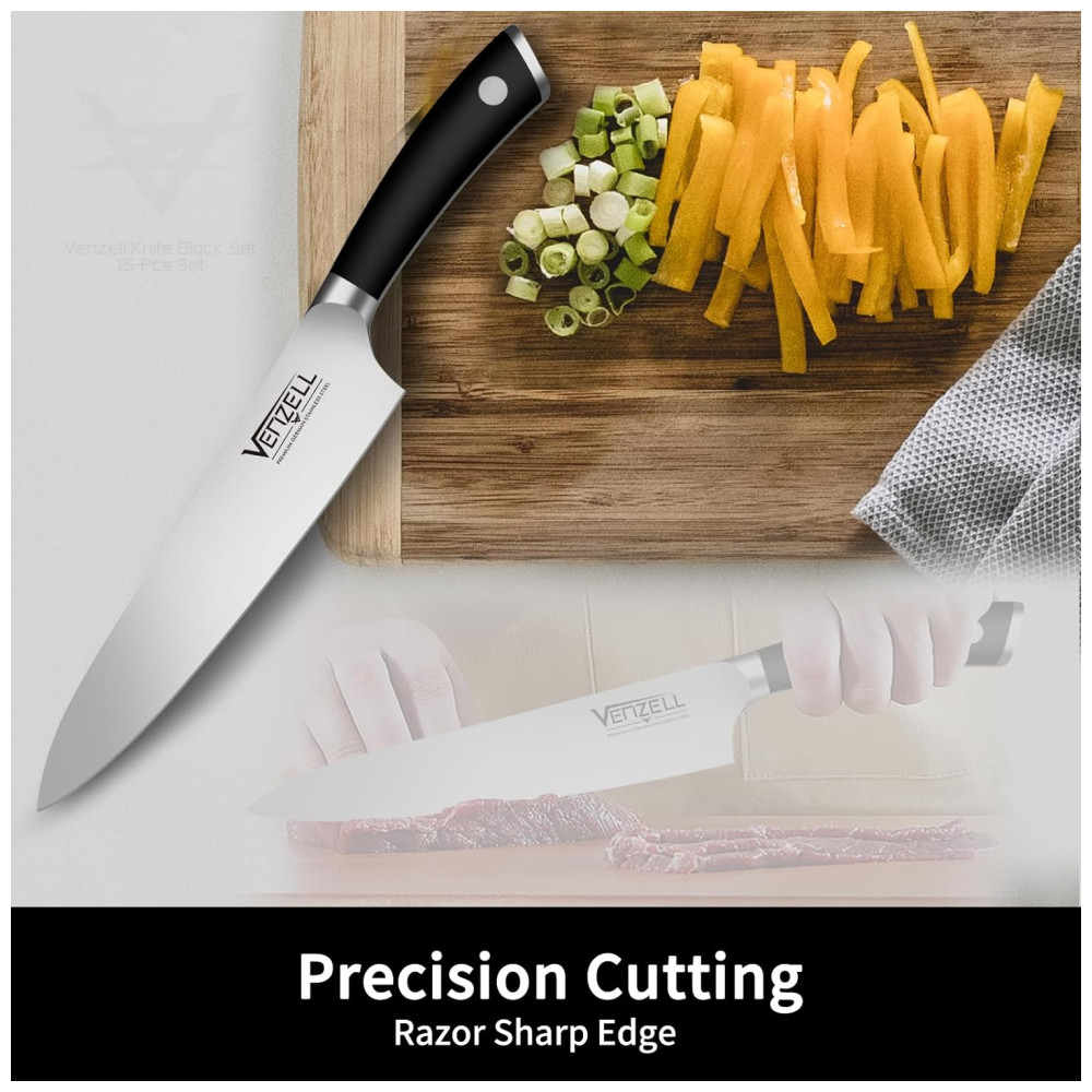 Conjunto de facas de lâmina afiada Conjunto de facas VENZELL construído com aço inoxidável alemão de alto carbono, bordas polidas à mão, garantindo desempenho duradouro. Permitindo que você experimente cortes de precisão como um chef profissional.