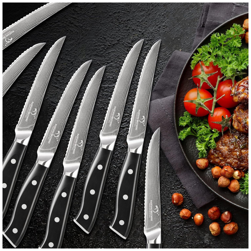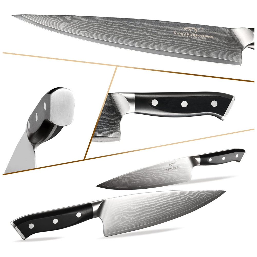 DESIGN DE QUALIDADE As facas são fabricadas com lâminas de aço damasco superior de 67 camadas com núcleo de aço VG10 para precisão e exatidão. Dureza HRC 602 para nitidez excepcional, retenção de borda. Alça de design curvo oferece conforto e suporte.