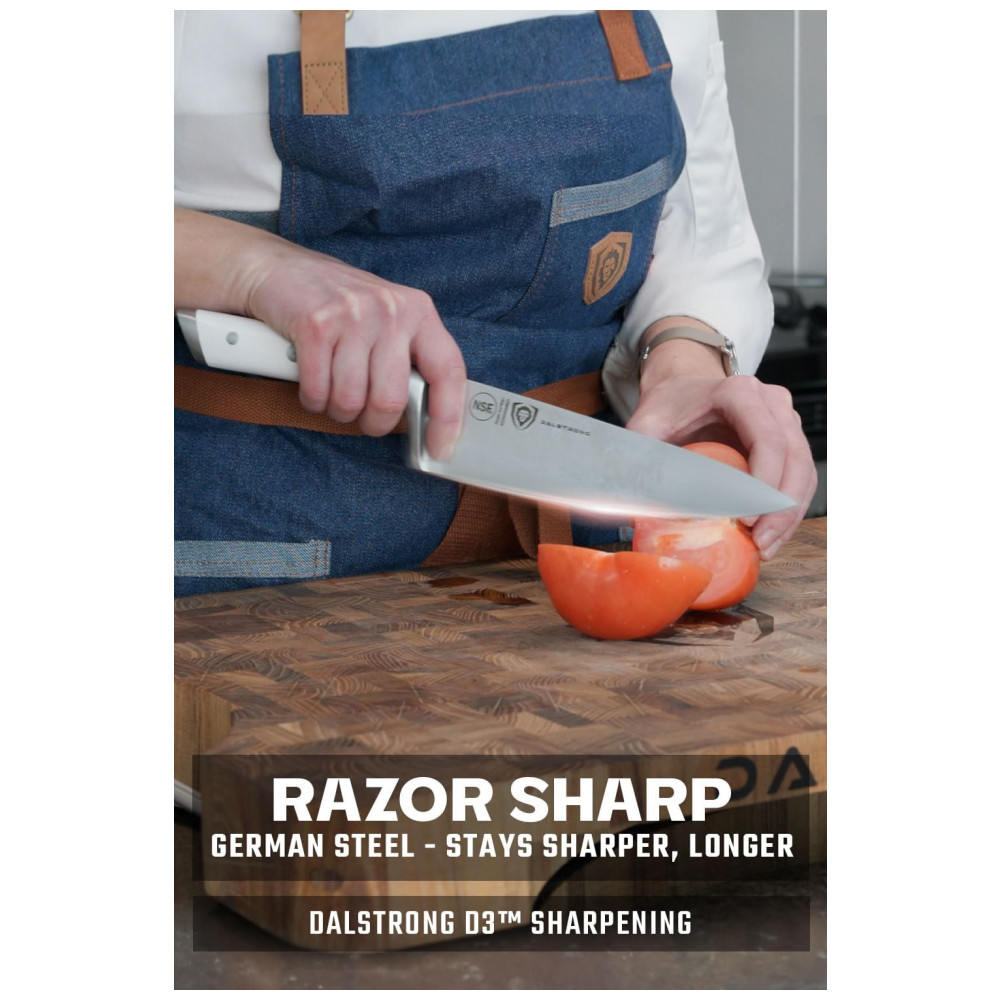 Incrivelmente afiado, full tang, aço alemão importado de alto carbono com uma borda polida à mão em 16 18 graus por lado. Precisamente temperado e resistente a manchas. Este conjunto vai durar uma vida.