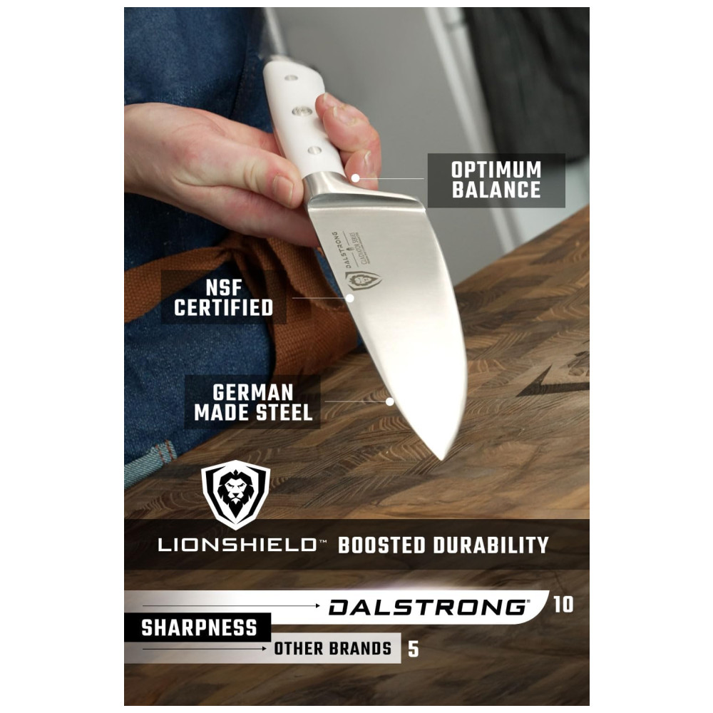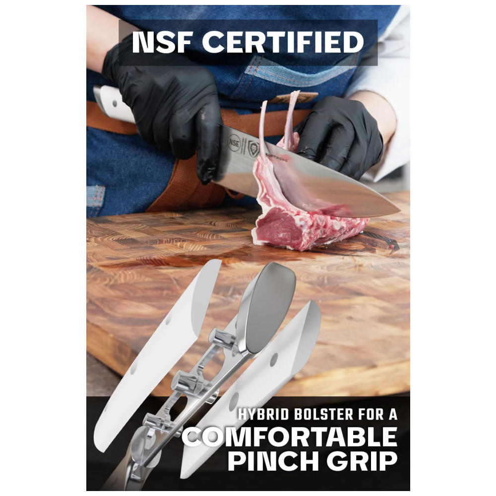 Design famoso, com peso satisfatório, materiais premium e sensação de qualidade. As alças de polímero ABS de luxo são rebitadas triplamente com uma aderência que garante conforto e manobrabilidade. Laminado e polido para uma construção sanitária, perfeito para cozinhas ocupadas. Certificado pela National Sanitation Foundation NSF aplica se apenas a facas.