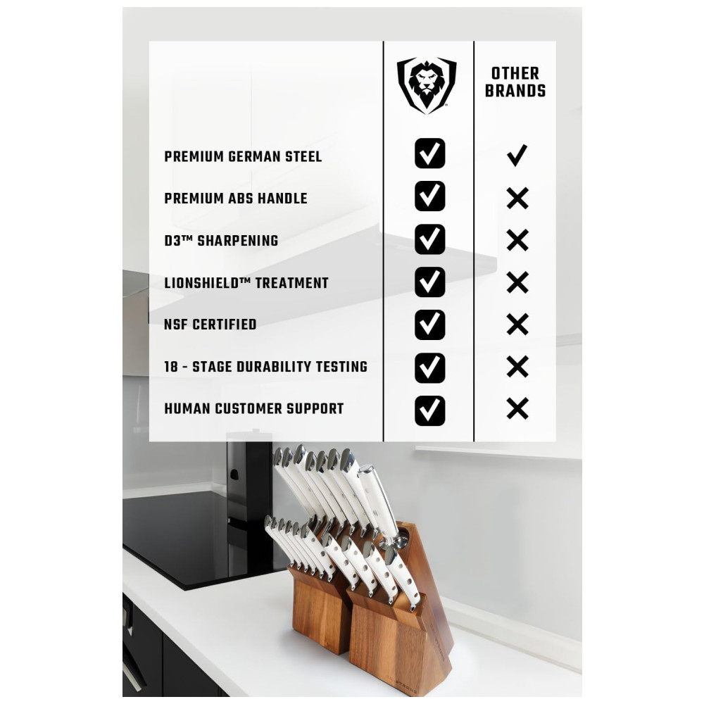 Projetado com perfeição com dureza Rockwell 56 e polido à mão para um acabamento acetinado. Cuidadosamente afilado para maior dureza, flexibilidade e resistência mínima ao corte. Conjunto completo em um impressionante bloco de madeira de acácia feito à mão. Certificado pela National Sanitation Foundation NSF aplica se a facas