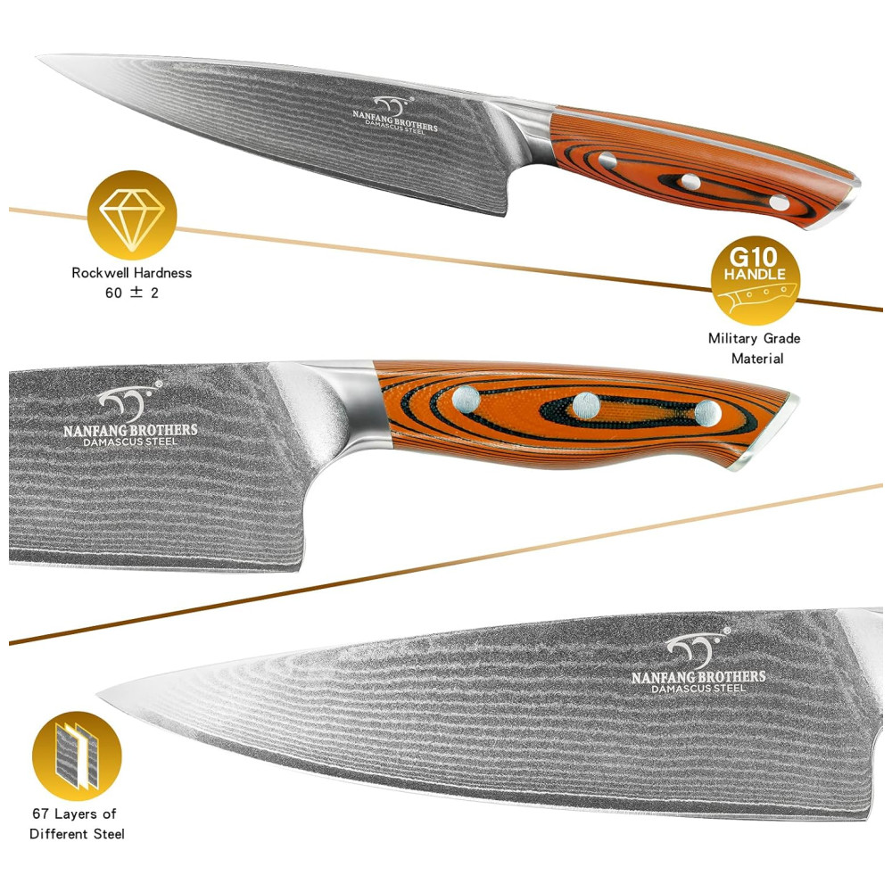 PROJETO DE QUALIDADE As facas são fabricadas com núcleo de aço VG10 67 camadas de lâminas de aço damasco superiores para precisão e exatidão. Dureza HRC 602 para nitidez excepcional, retenção de borda. Alça de design curvo proporciona conforto e suporte.