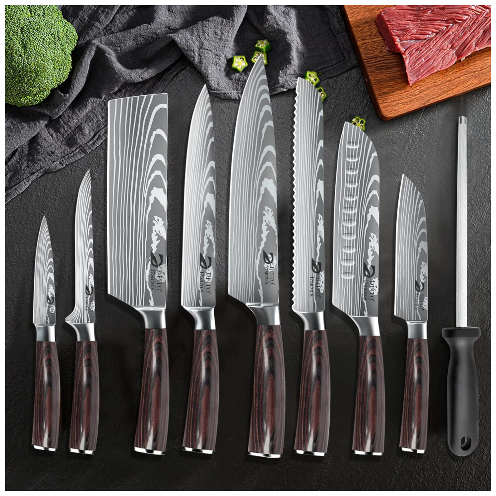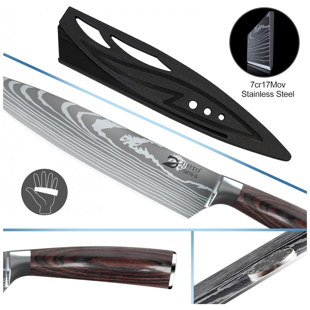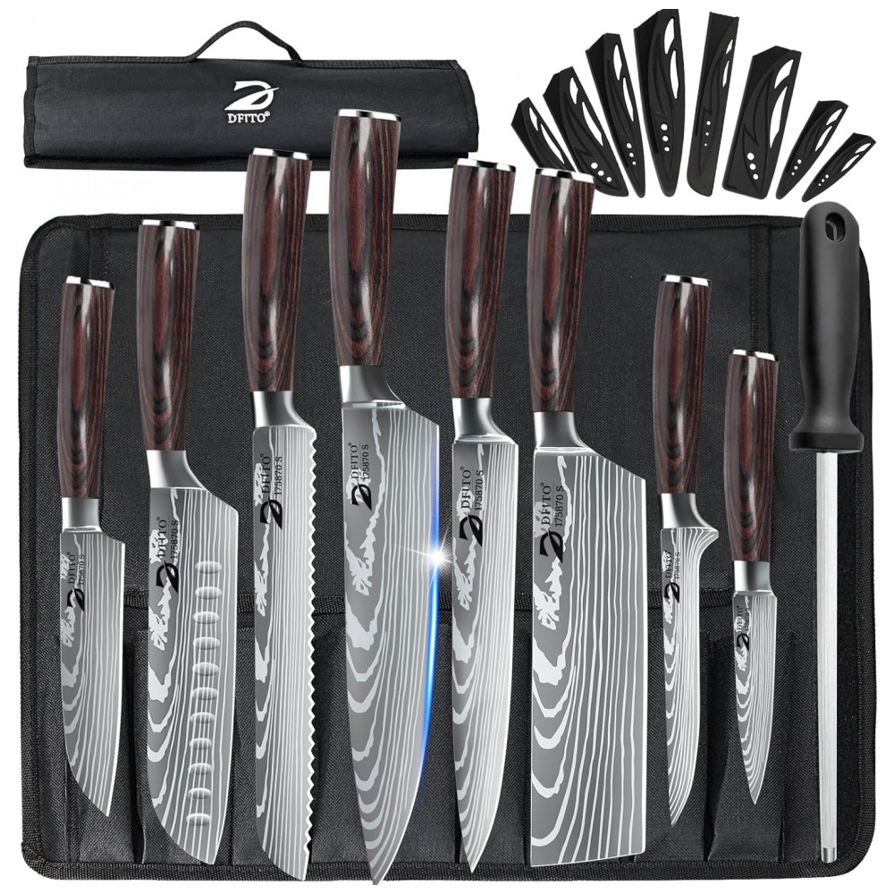 Materiais de alta qualidade O conjunto de facas profissionais é feito de aço inoxidável alemão à prova de ferrugem de alto carbono. Aço inoxidável especial de alta qualidade 5cr15mov A dureza Rockwell é 56 58, com alta qualidade, nitidez e durabilidade.