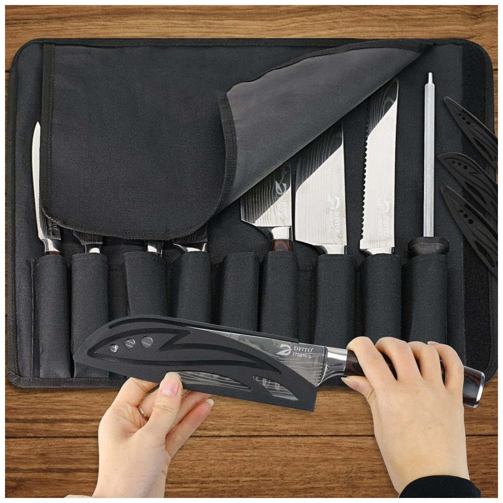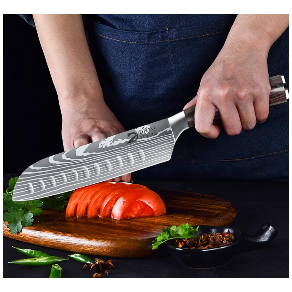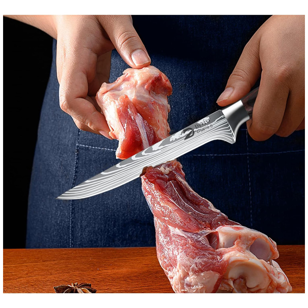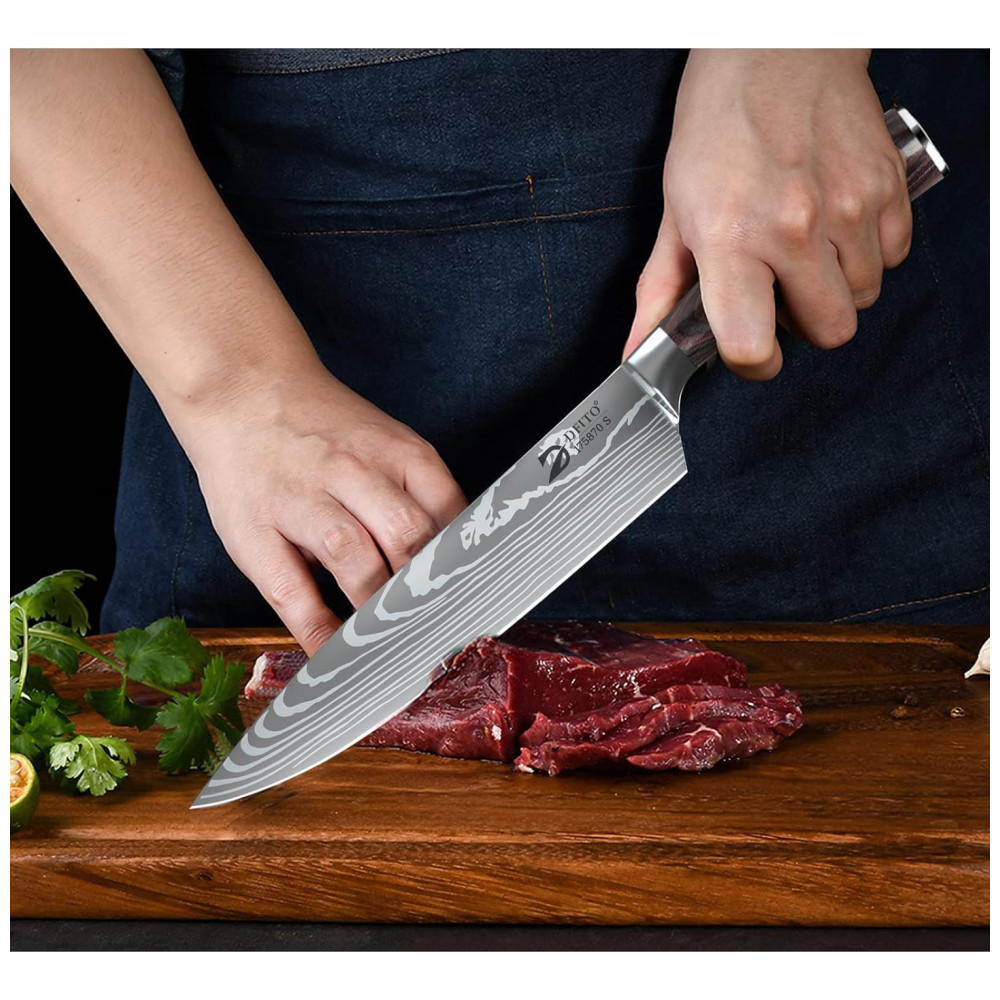 Materiais de alta qualidade O conjunto de facas profissionais é feito de aço inoxidável alemão à prova de ferrugem de alto carbono. Aço inoxidável especial de alta qualidade 5cr15mov A dureza Rockwell é 56 58, com alta qualidade, nitidez e durabilidade.