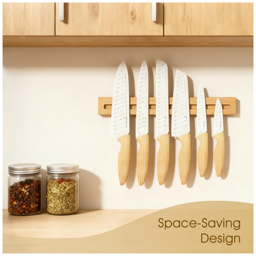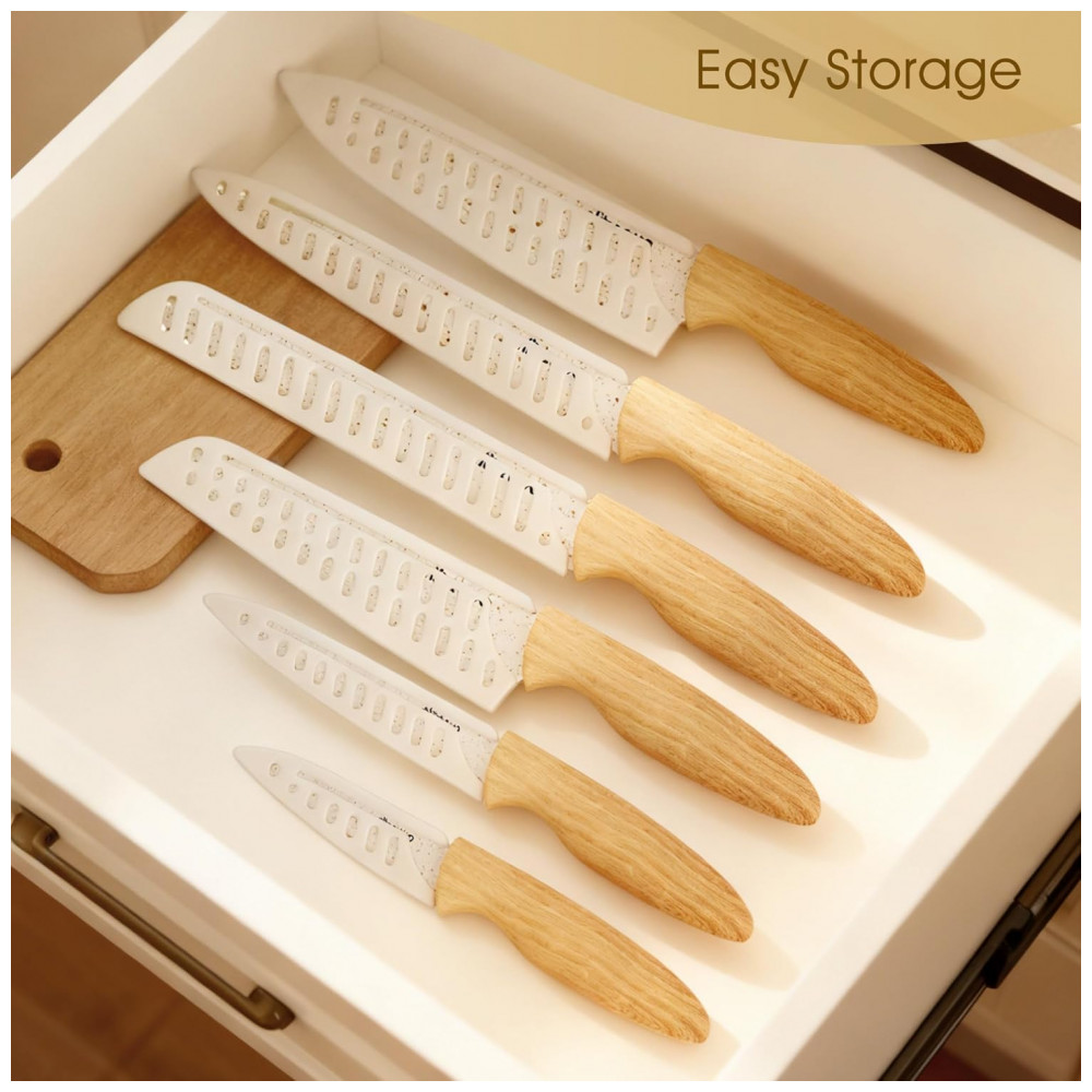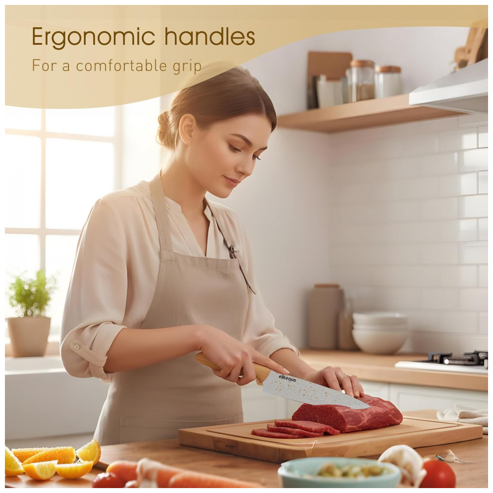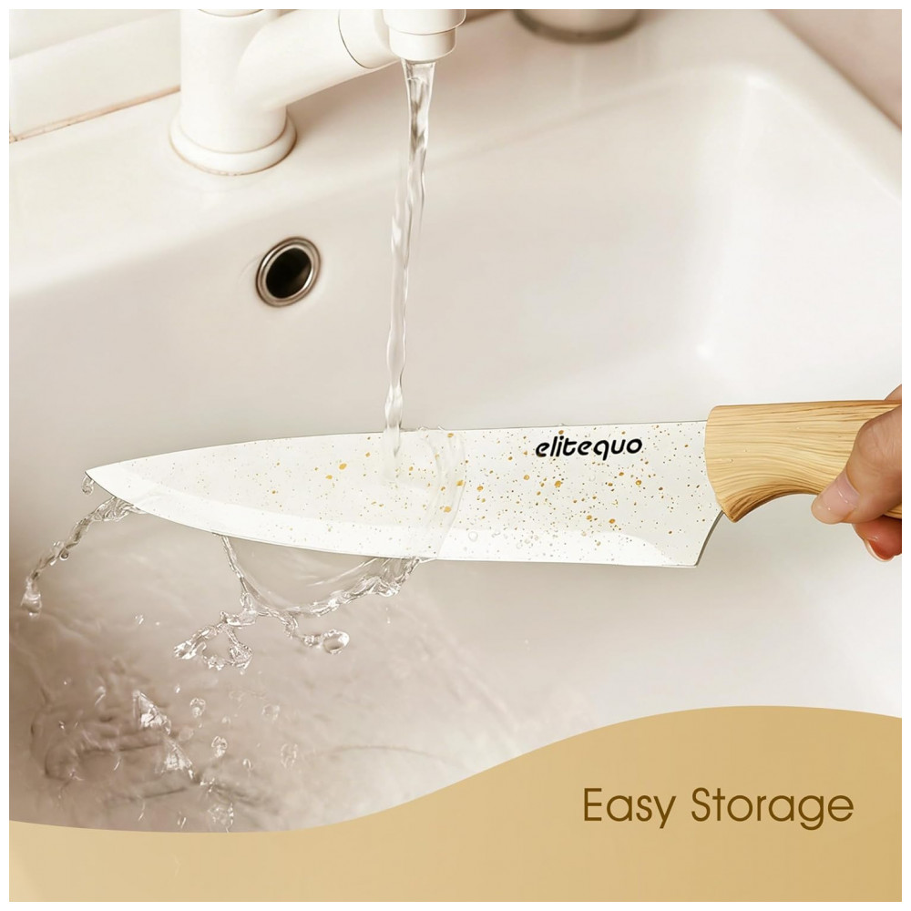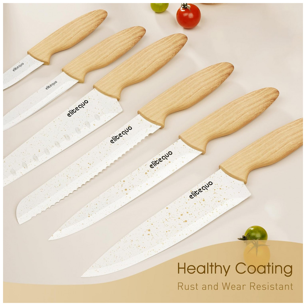 O conjunto de facas de cozinha elitequo de 6 peças em aço inoxidável de alto carbono oferece lâminas estampadas com revestimento antiaderente para cortes suaves em alimentos variados durante preparos diários, adequado para espaços compactos ou armazenamento em gavetas. Inclui bainhas protetoras individuais para proteção das lâminas e portabilidade. Cabos em plástico com padrão madeira e TPR ergonômicos promovem aderência segura mesmo com mãos úmidas.