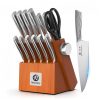 • Capacidade: 14 peças (1 faca chef 20 cm, 1 faca fatiadora 20 cm, 1 santoku 18 cm, 1 faca para pão 20 cm, 1 faca utilitária 13 cm, 1 faca de aparar 9 cm, 6 facas para bife serrilhadas 11 cm, 1 tesoura de cozinha, 1 bloco com afiador)