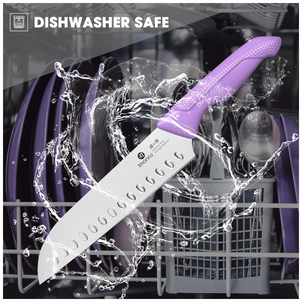 Lâminas em aço inoxidável com bordas lisas e serrilhadas garantem cortes uniformes em carnes, pães e vegetais. O cabo roxo em polipropileno oferece aderência segura em superfícies úmidas.