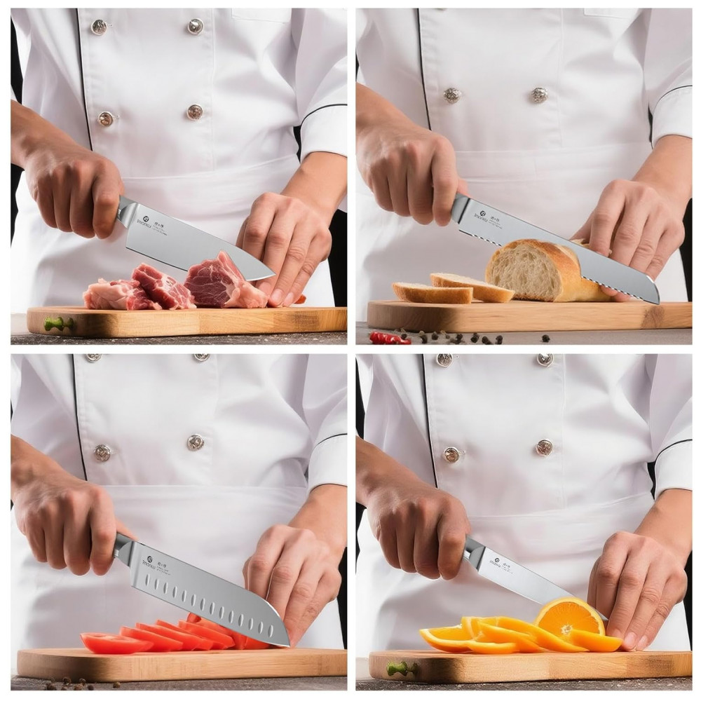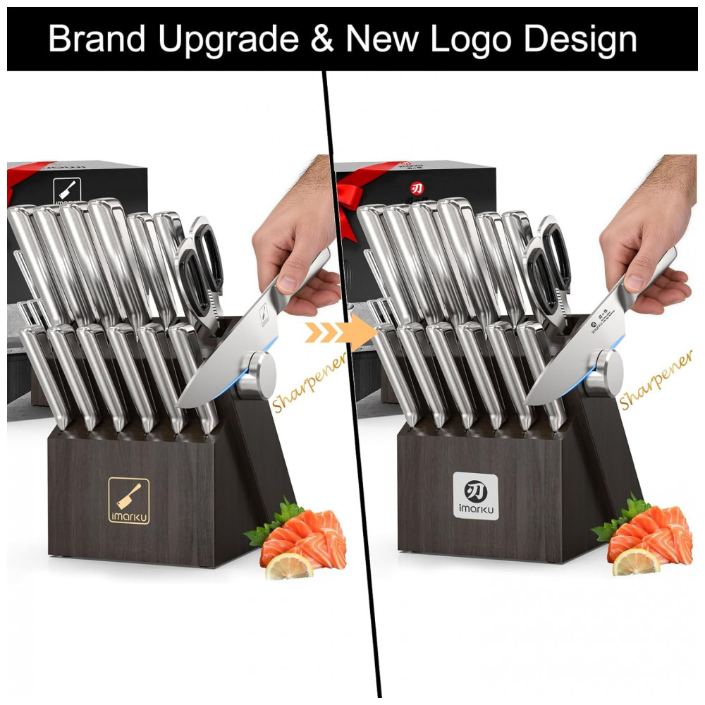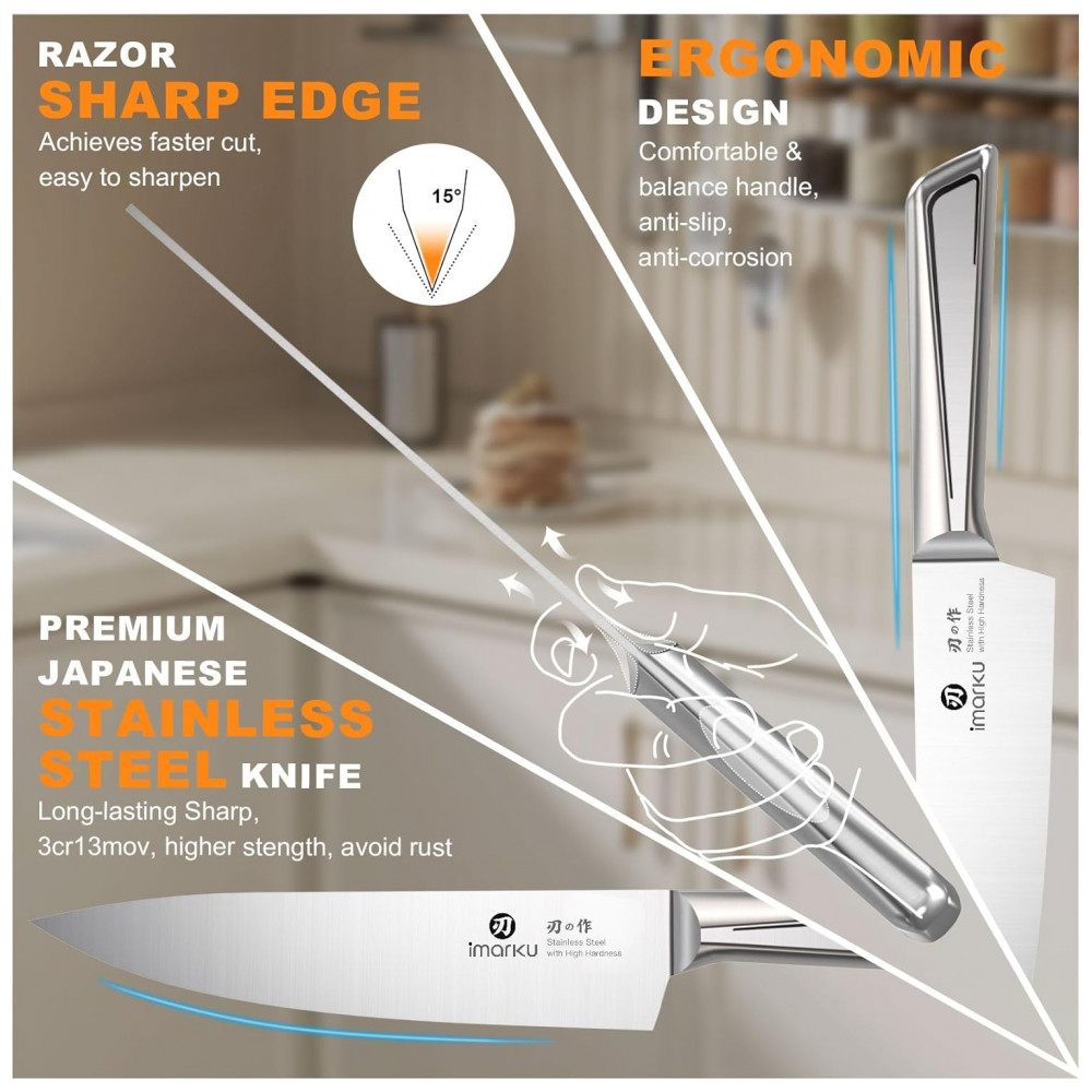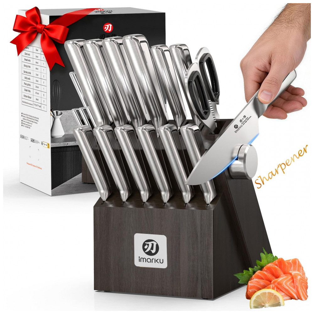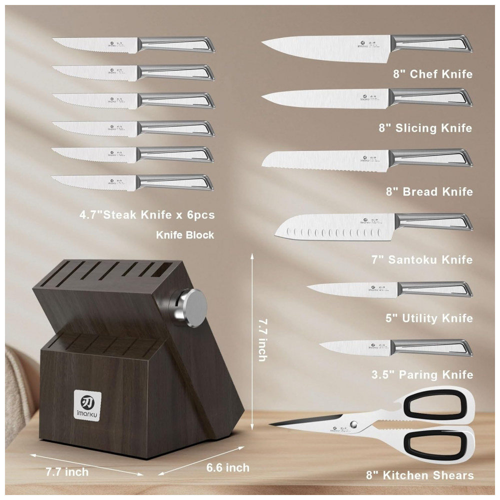 O conjunto de facas de cozinha imarku G14 de 14 peças em aço inoxidável de alto carbono oferece lâminas forjadas com afiação ajustável via afiador embutido no bloco de madeira, adequado para corte de alimentos em preparos domésticos ou profissionais. Inclui facas de tamanhos variados para tarefas como fatiar, picar e trinchar, com design ergonômico para equilíbrio durante o uso prolongado.