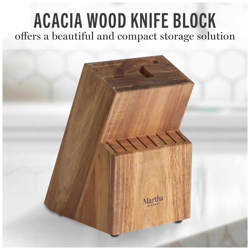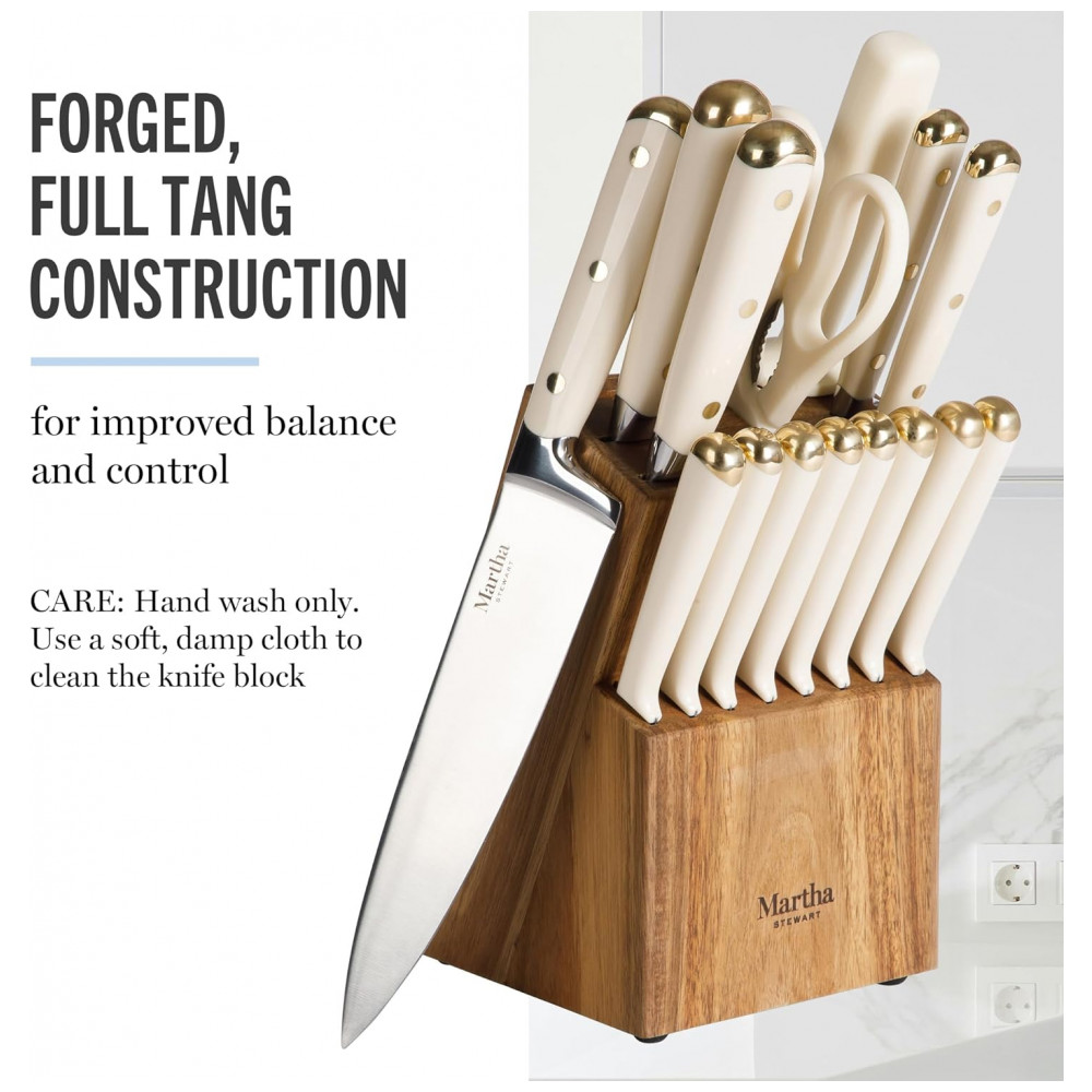 Conjunto de Facas de Cozinha Martha Stewart Lockton 16 Peças Branco Linho com Detalhe Dourado e Bloco em Acácia
