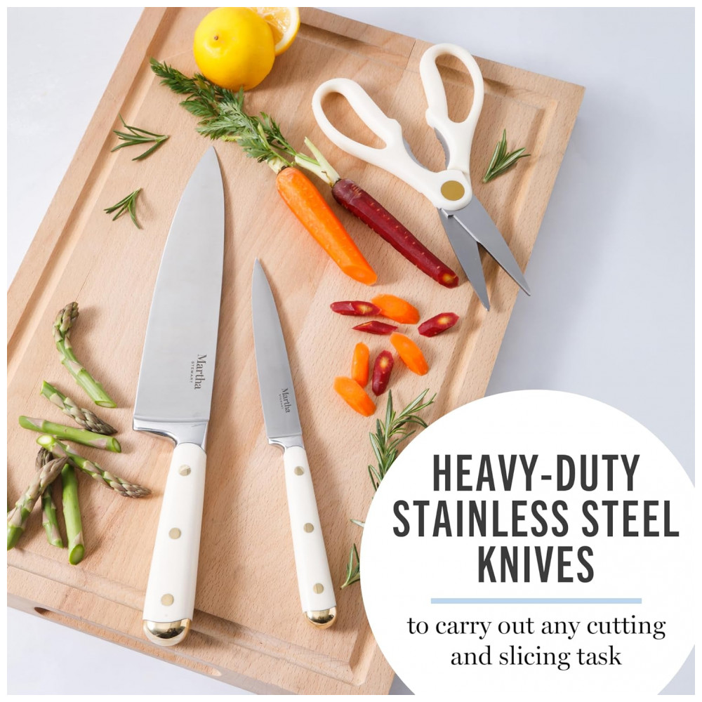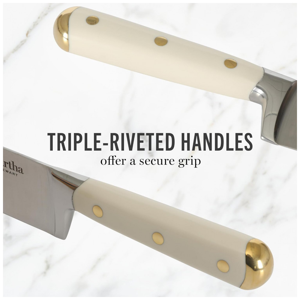 O conjunto de facas de cozinha Martha Stewart Lockton de 16 peças em aço inoxidável de alto carbono apresenta lâminas forjadas full tang com distribuição uniforme de peso para controle em cortes de carnes, vegetais, pães e frutas, adequado para preparos domésticos variados. Inclui bloco em madeira de acácia para armazenamento compacto na bancada e haste de afiação para manutenção do fio. Cabos ergonômicos em ABS com três rebites e acabamento branco linho/dourado oferecem aderência segura.