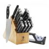 • Capacidade: 14 peças (1 chef 20 cm, 1 fatiadora 20 cm, 1 pão 20 cm, 1 utilitária 13 cm, 1 aparar 9 cm, 6 bife 11 cm, 1 tesoura, 1 haste afiação, 1 bloco madeira)