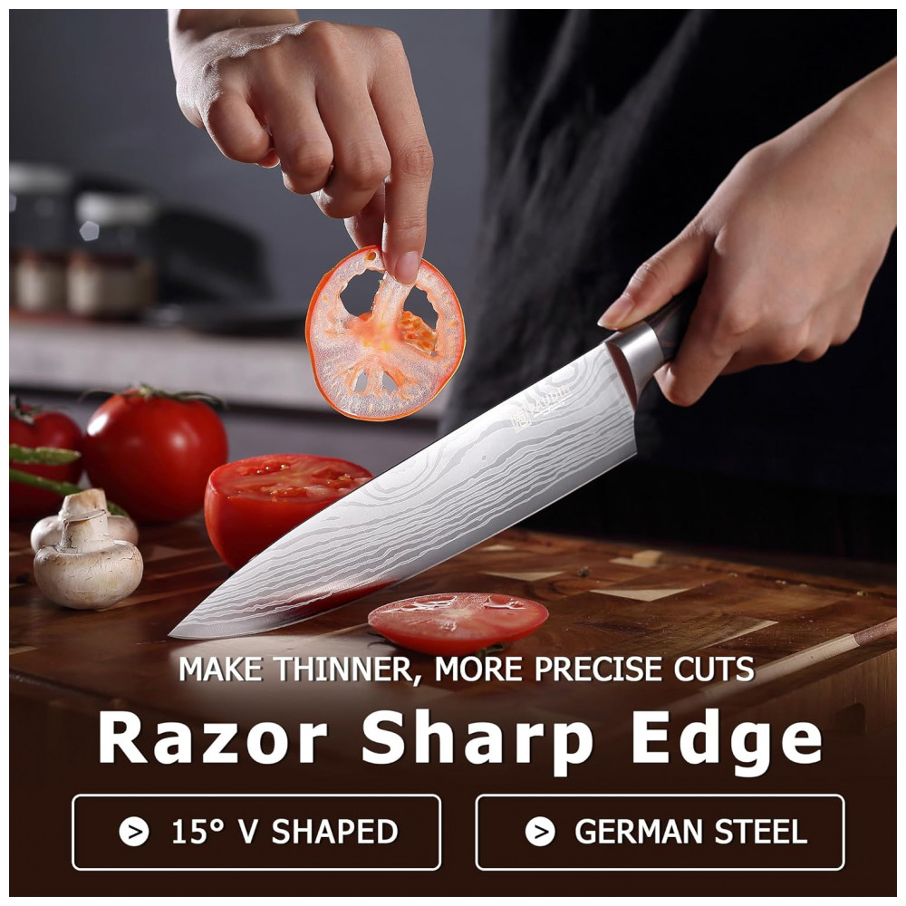 O conjunto de facas de cozinha PAUDIN de 14 peças em aço inoxidável de alto carbono alemão oferece lâminas forjadas com afiação manual em ângulo V de 14 graus por lado e dureza Rockwell 54+, adequado para cortes precisos em carnes, vegetais, pães e frutas durante preparos domésticos completos. O bloco em madeira robusta organiza as facas com proteção contra oxidação e inclui haste de afiação para manutenção do fio. Cabos em pakkawood ergonômicos proporcionam aderência segura e equilíbrio em uso prolongado.