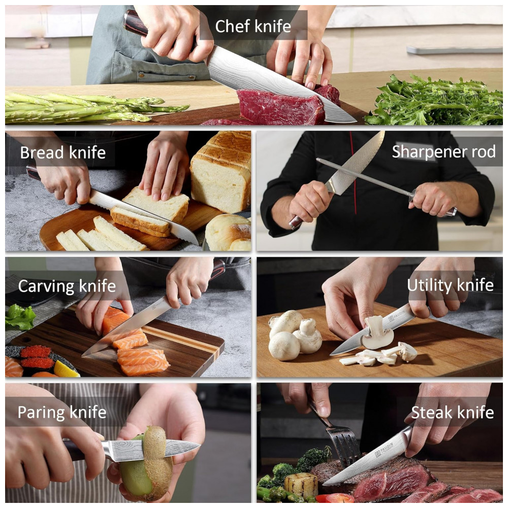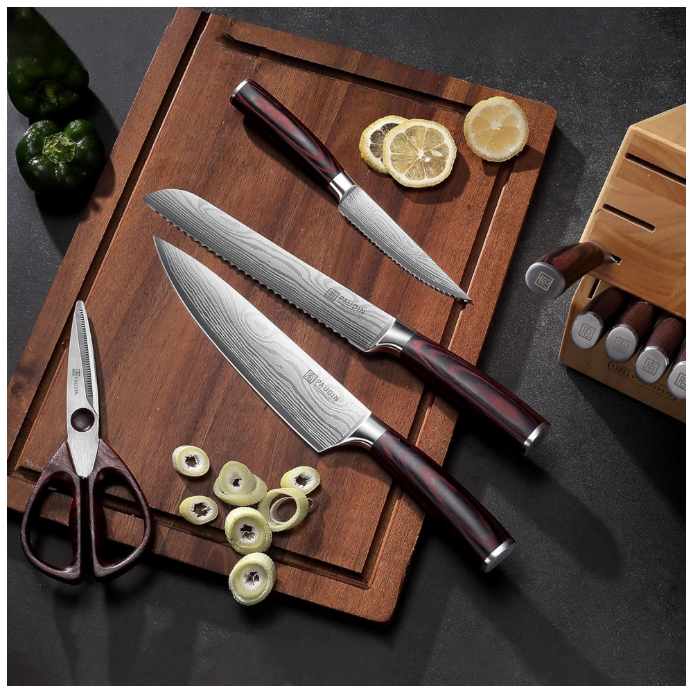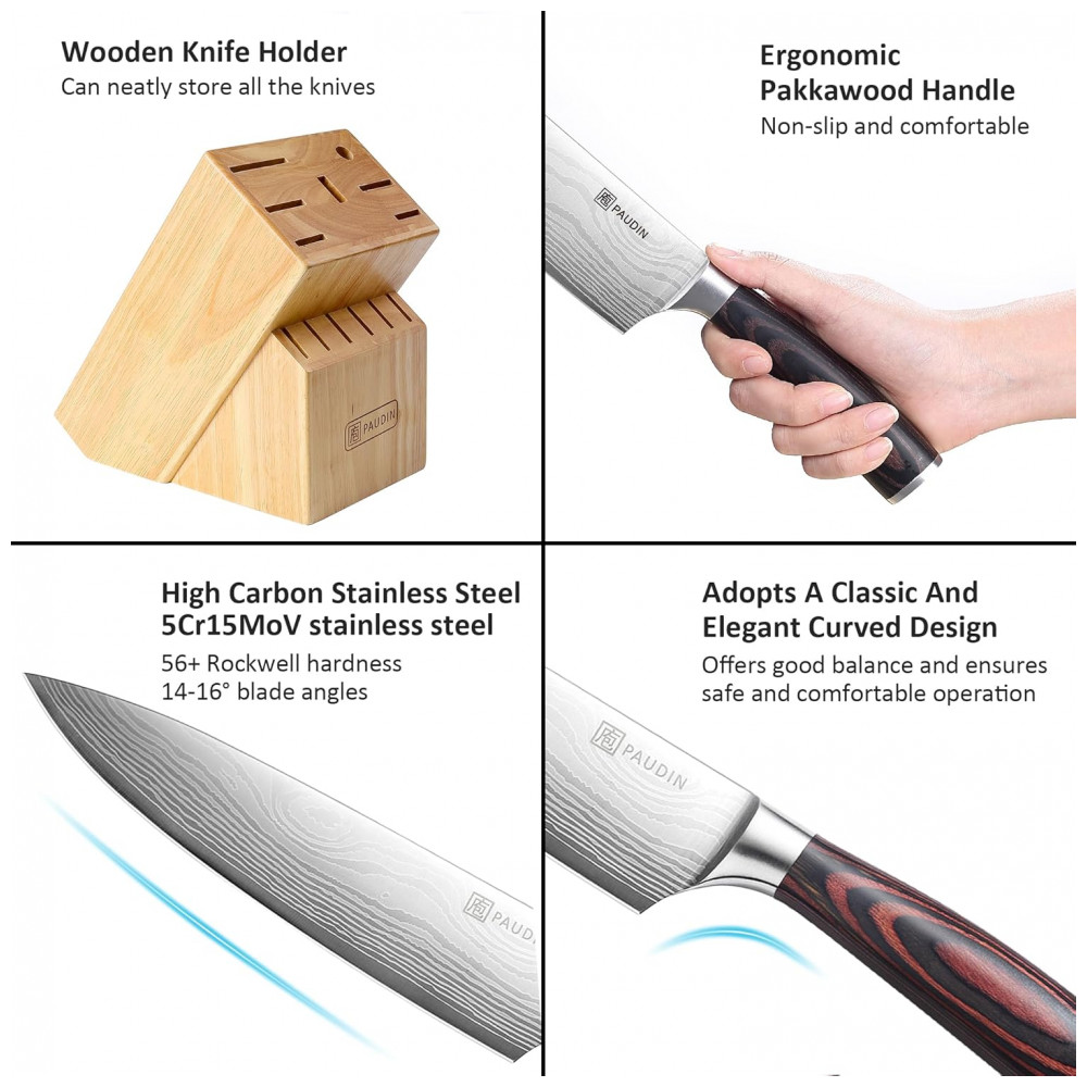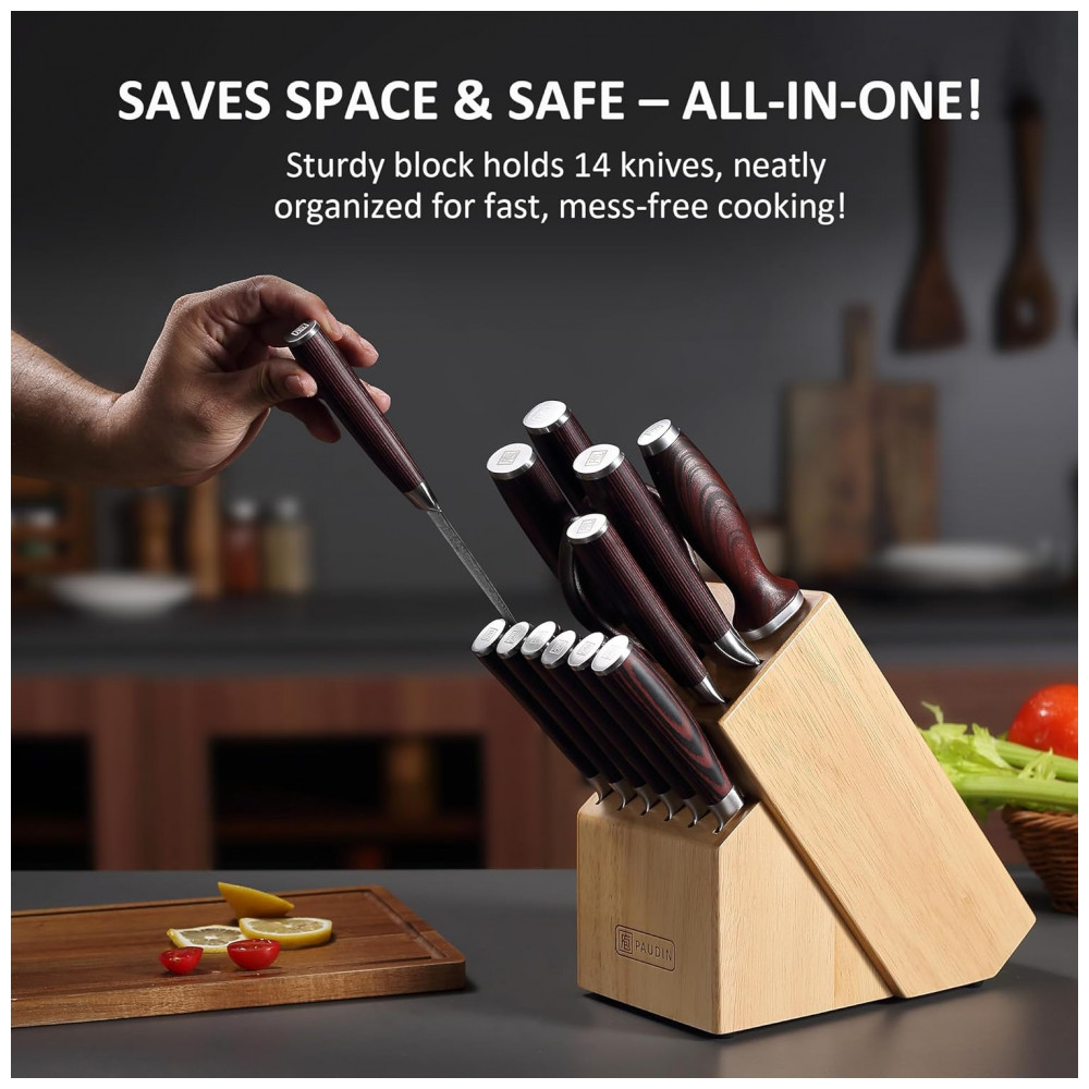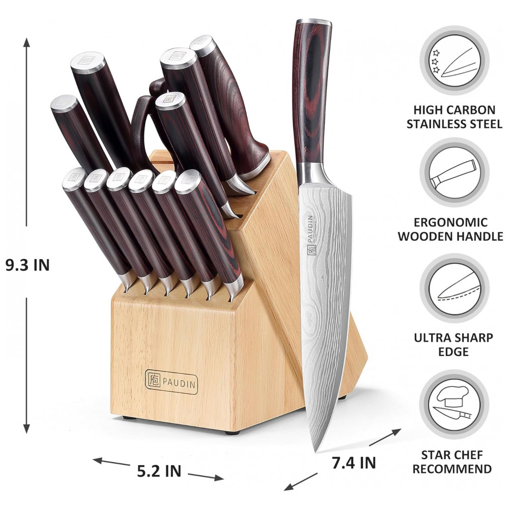 Conjunto de Facas de Cozinha PAUDIN 14 Peças com Bloco em Madeira e Cabo Pakkawood Ergonômico