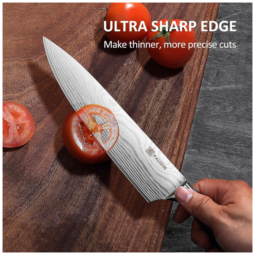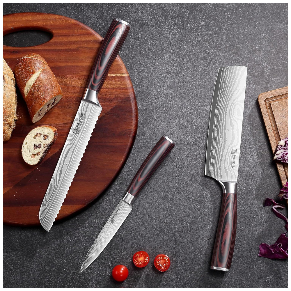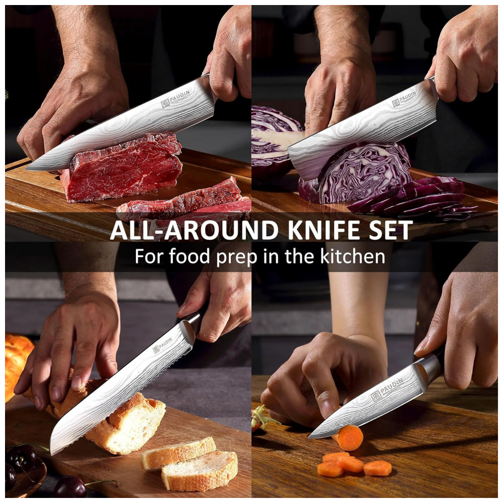 O conjunto de facas de cozinha PAUDIN de 7 peças em aço inoxidável de alto carbono 5Cr15MoV oferece lâminas forjadas com espessura de 2 mm e afiação em ângulo V duplo de 15 graus por lado, adequado para cortes precisos em carnes, vegetais, frutas, pães e preparos profissionais ou domésticos. A dureza Rockwell 56+ proporciona retenção prolongada do fio com manutenção mínima. Cabos em pakkawood ergonômico previnem rachaduras, deformações e descoloração em uso contínuo.