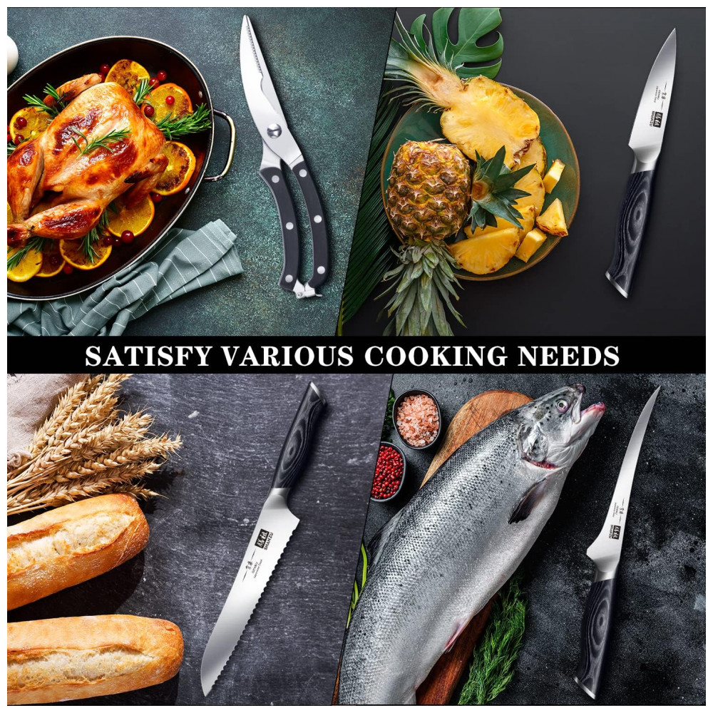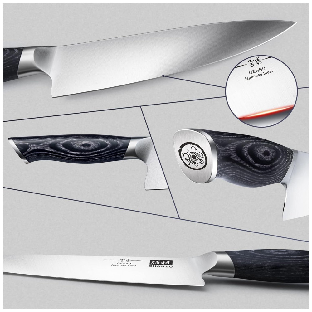 O conjunto de facas de cozinha SHAN ZU Genbu de 14 peças utiliza aço super japonês forjado com 32 etapas de fabricação incluindo polimento e afiação manual, adequado para cortes precisos em preparos domésticos variados de carnes, peixes, vegetais e pães. O bloco em madeira de acácia apresenta seção removível para 6 facas de bife, permitindo organização flexível na bancada. Cabos ergonômicos em polipropileno K133 com design Black Tortoise Genbu promovem aderência e equilíbrio.