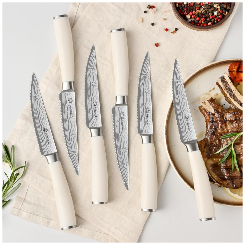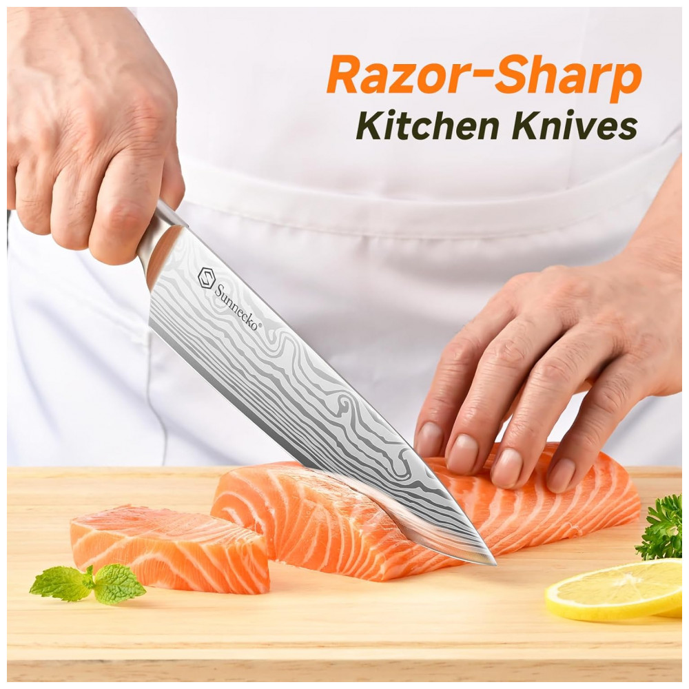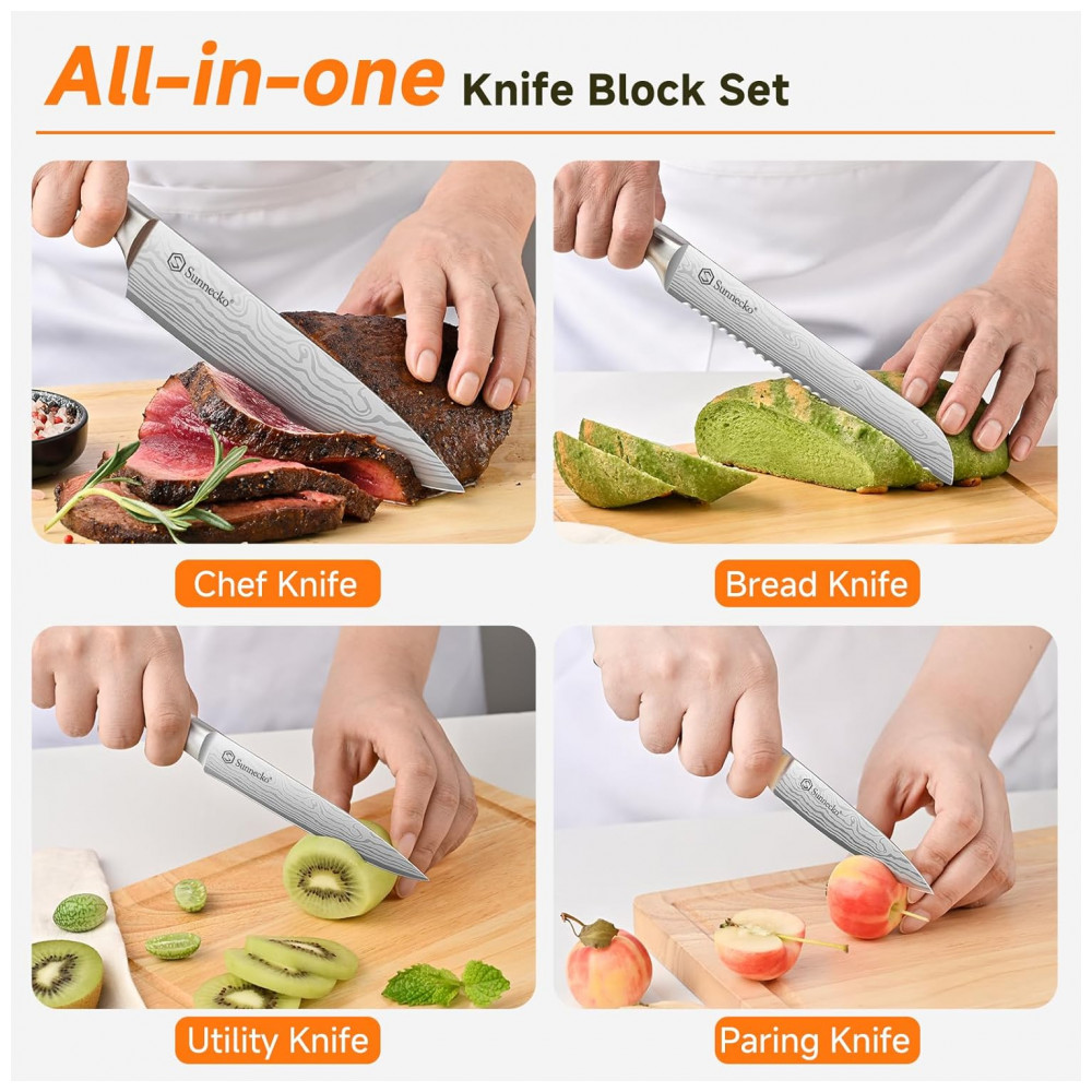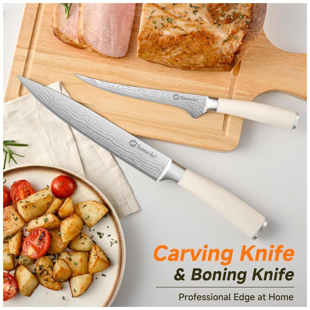 O conjunto de facas de cozinha Sunnecko de 15 peças em aço inoxidável de alto carbono oferece lâminas estampadas com afiação precisa para cortes em carnes, peixes, vegetais e pães durante preparos domésticos variados. Inclui bloco de madeira dura para organização na bancada e haste de afiação para manutenção do fio. Cabos ergonômicos em ABS brancos promovem aderência segura e equilíbrio durante uso prolongado.