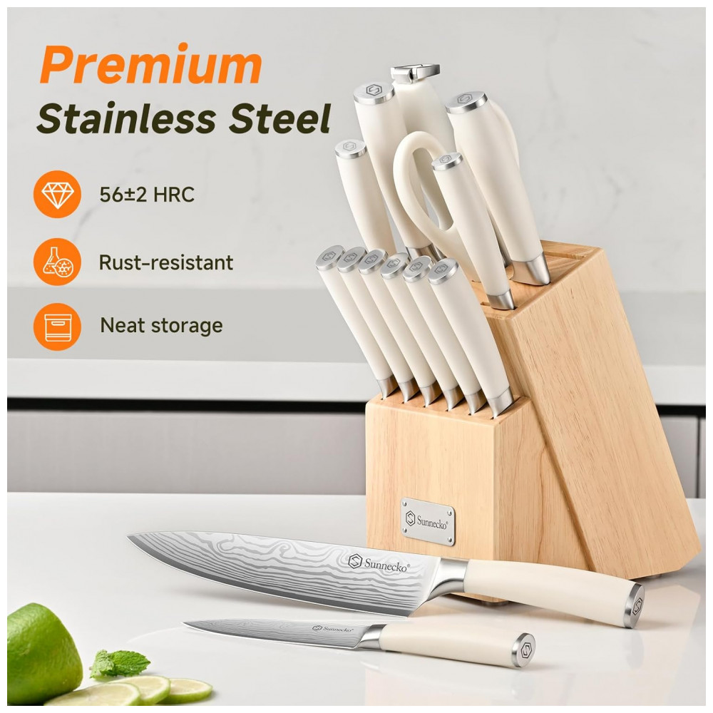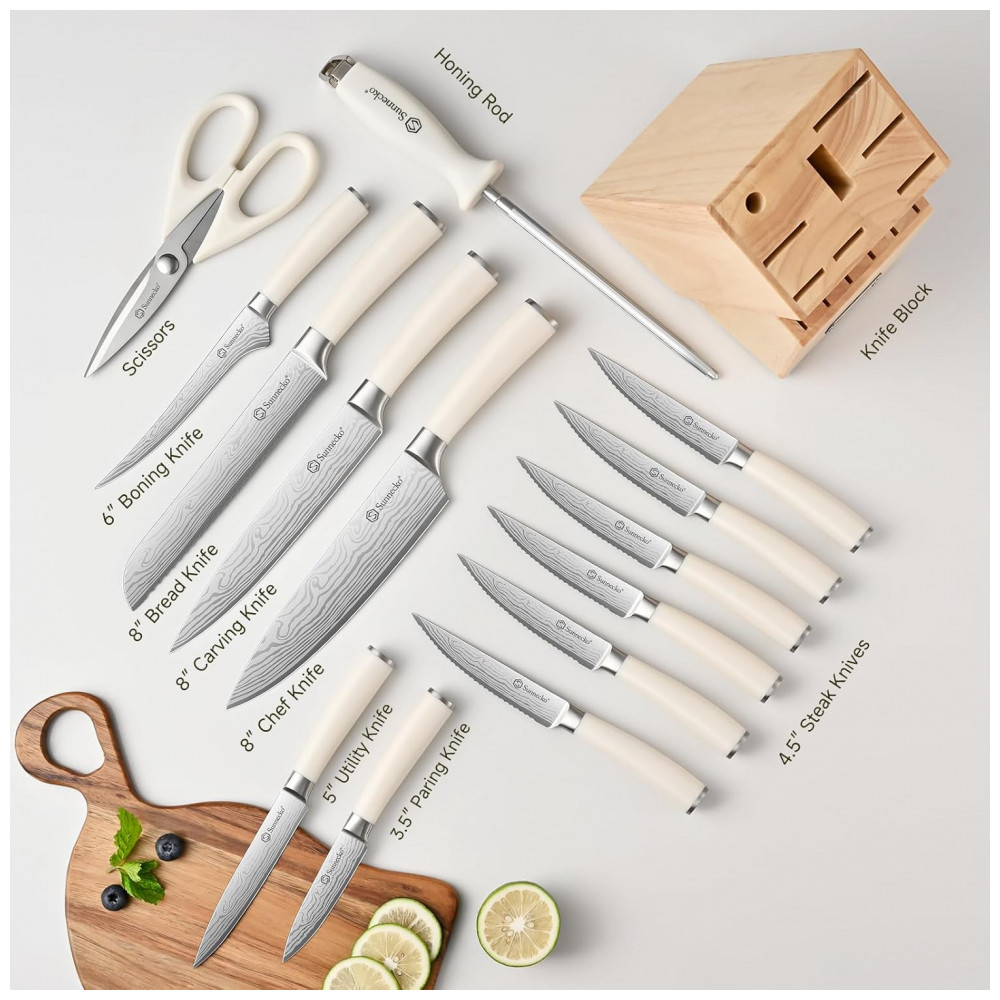 Conjunto de Facas de Cozinha Sunnecko 15 Peças Branco com Afiador e Bloco em Madeira