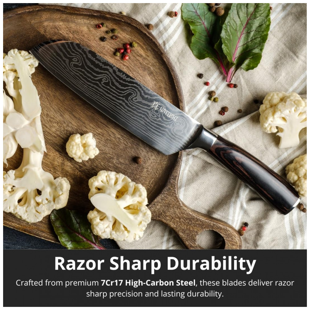 • Material da lâmina: aço inoxidável alto carbono 7Cr17 (HRC 57-58, padrão ondulado)