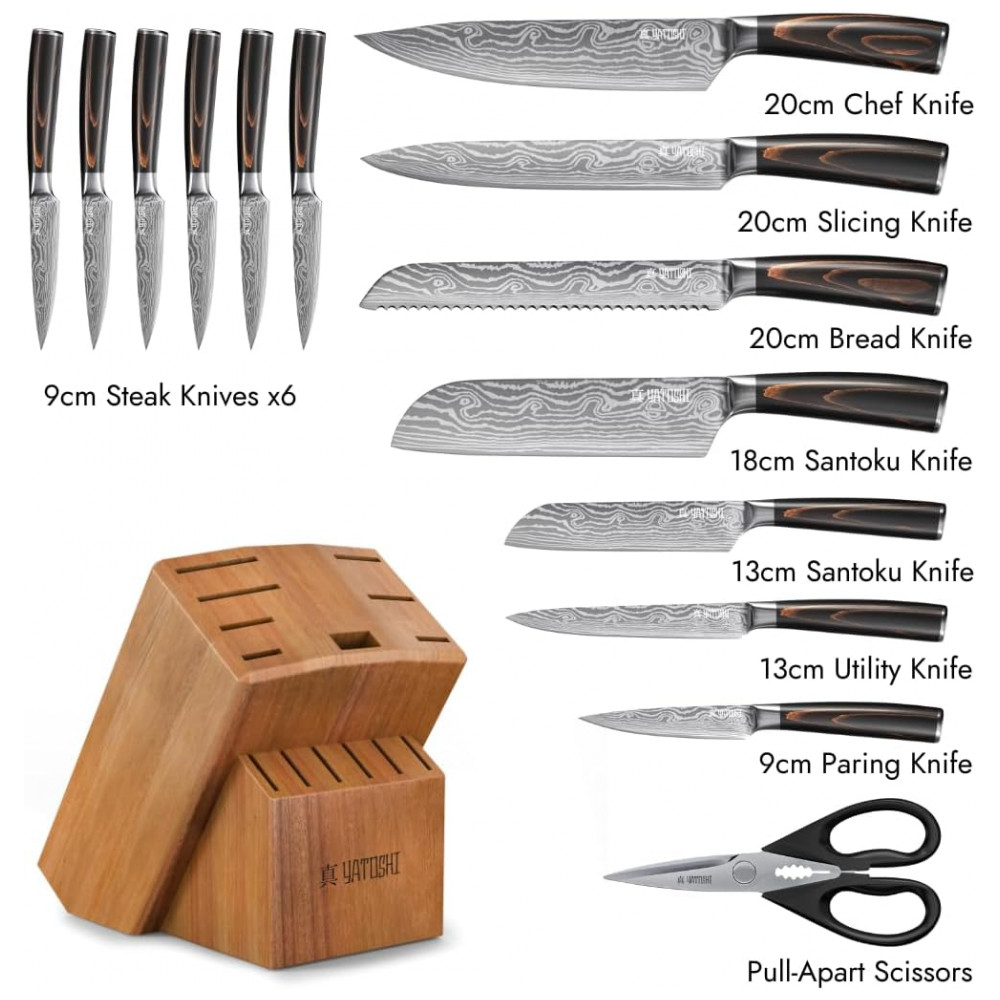 Conjunto de Facas de Cozinha Yatoshi Professional 15 Peças Marrom com Bloco em Acácia e Cabo Pakkawood