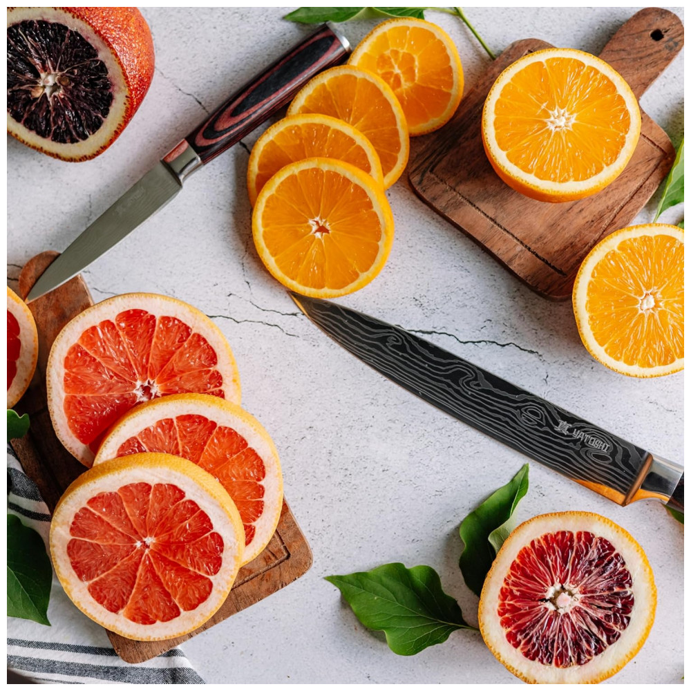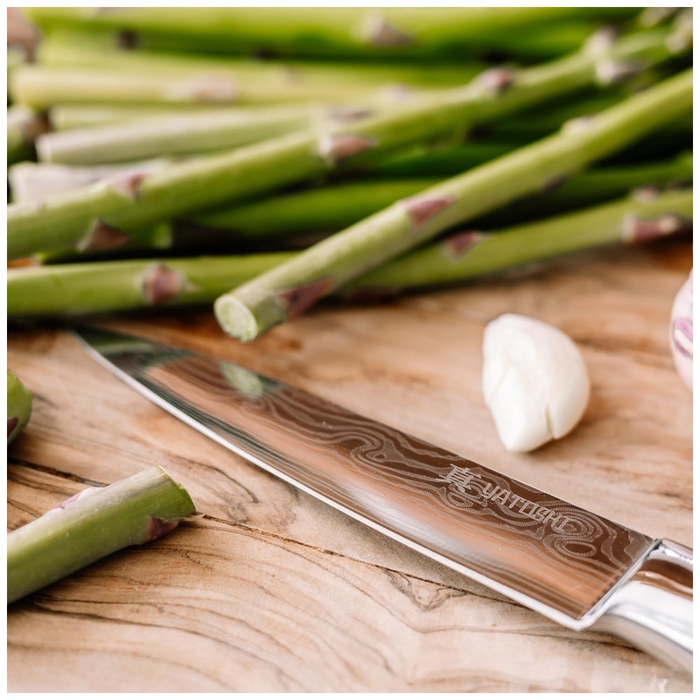 O conjunto de facas de cozinha Yatoshi Professional de 15 peças utiliza aço inoxidável de alto carbono 7Cr17 com teor de carbono 0,6-0,75% e dureza Rockwell 57-58 para cortes precisos em preparos domésticos variados de carnes, vegetais, pães e frutas. O bloco em madeira de acácia com base antiderrapante organiza as lâminas com ranhuras profundas e proteção adequada. Cabos em pakkawood ergonômico com bolster inclinado promovem pegada pinch grip natural e controle total da lâmina com padrão ondulado elegante.