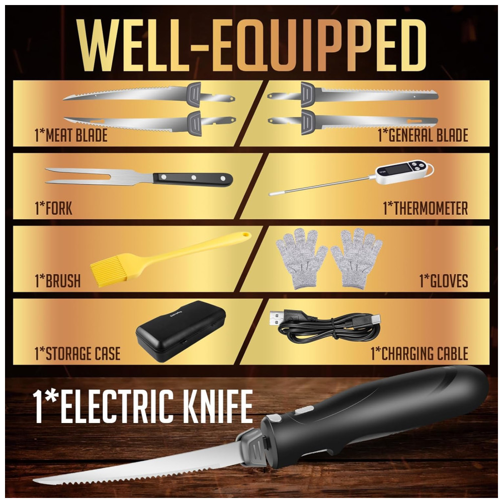 Realize cortes fáceis e eficientes com as Facas Elétricas Recarregáveis Sem Fio da Royalsellpro. Com controles intuitivos e lâminas serrilhadas de alta performance, a funcionalidade simples e o corte preciso são garantidos. A construção profissional da faca para escultura de peru mantém a afiação duradoura, lidando sem esforço com qualquer tipo de alimento e artesanato. A montagem é simples e a limpeza descomplicada, pois as lâminas removíveis são laváveis na lava-louças. A conveniência do carregamento USB elimina a necessidade de uma tomada elétrica, oferecendo maior flexibilidade. A empunhadura ergonômica proporciona conforto, reduzindo a fadiga da mão, enquanto a tecnologia avançada garante um desempenho confiável. O sistema de travamento de segurança mantém a lâmina no lugar durante o uso, evitando quedas acidentais. Além disso, o conjunto versátil inclui termômetro de alimentos, pincel de óleo, luvas de segurança, garfo para peru e duas lâminas especializadas. Com embalagem elegante e estojo de armazenamento, esta faca elétrica é uma escolha perfeita para presentear em qualquer ocasião. Surpreenda alguém especial com este conjunto completo, ideal para diversas necessidades culinárias. A resposta para cortes precisos e eficientes está ao seu alcance!