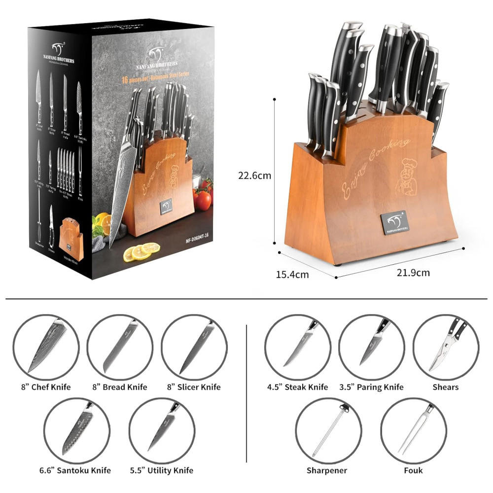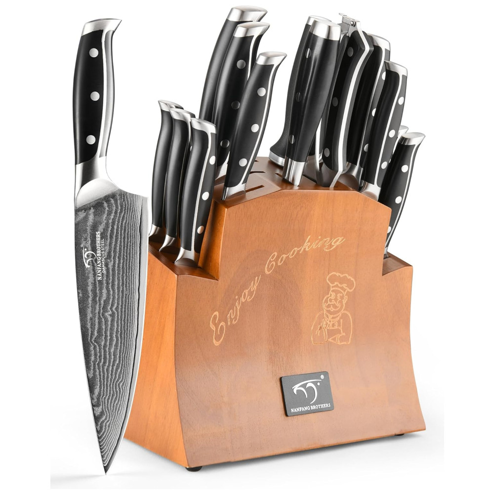 Conjunto de Facas em Aço Damasco VG10 com Bloco de Bancada e Afiador Embutido 16 Peças NANFANG BROTHERS Preto